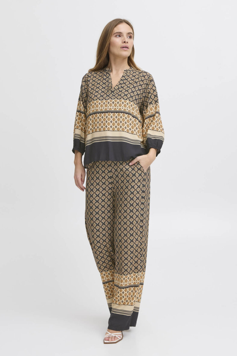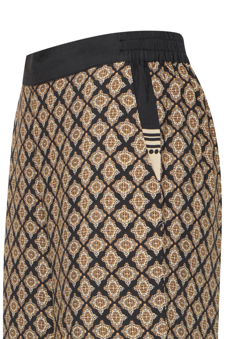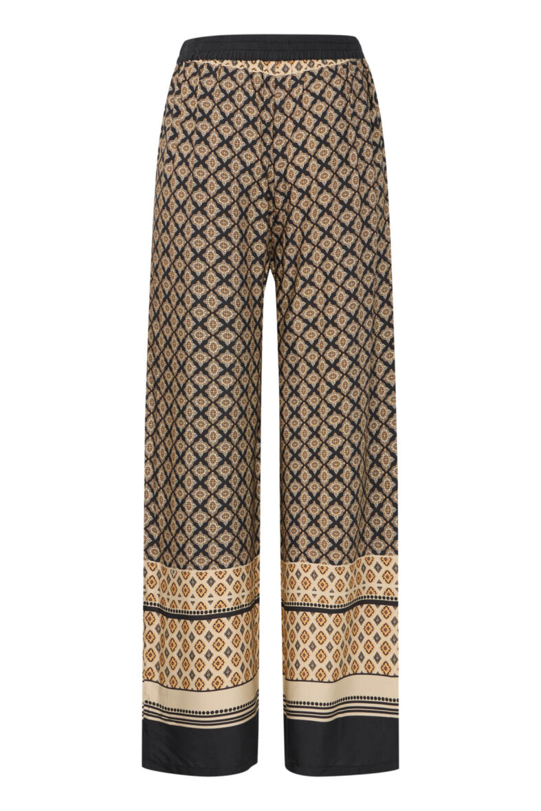 De mønstrede bukser er lavet i en let og luftig kvalitet i viskose. Buksen er med fast linning foran og elastisk linning bagpå, som sikrer en god pasform ved taljen. Med skrålommer i siderne.