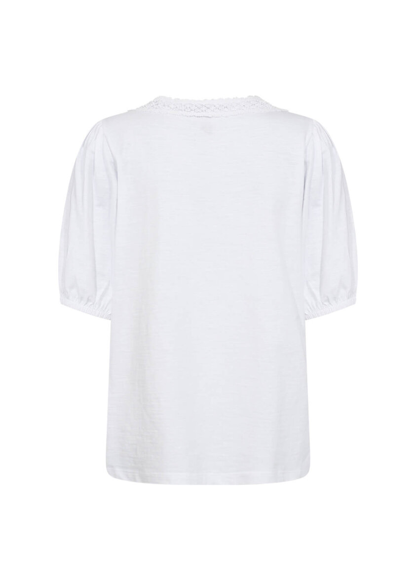En fin hvid t-shirt med feminine detaljer, som kan bruges til mange forskellige outfits. Style evt. med et par smarte jeans og en denim jakke over for et smart hverdags look.