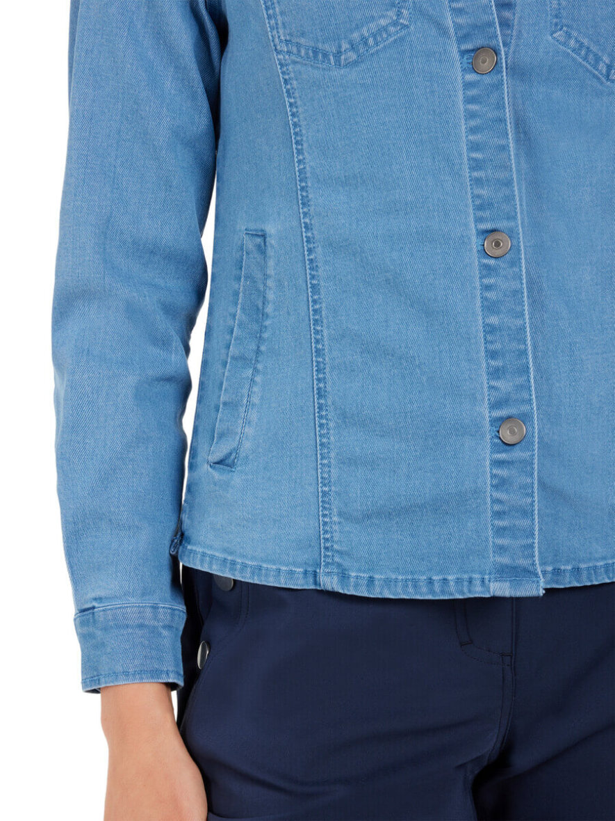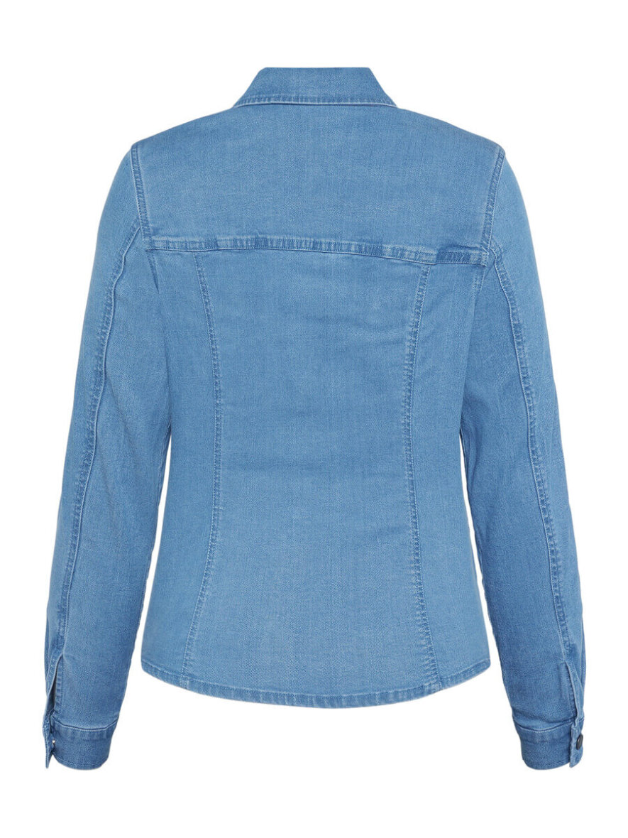 Jakken er med en klassisk skjorte krave samt gennemgående knapper langs fronten. Denim jakken er med lange ærmer med manchetknapper ved håndledet. Med to brystlommer med klap samt to åbne stiklommer. Jakken er lavet i et flot faconsyet design i en blød og strækbar kvalitet, som giver god bevægelighed og komfort. Ønskes en mere afslappet pasform, som stadig sidder flatterende, kan du med fordel gå en størrelse op.