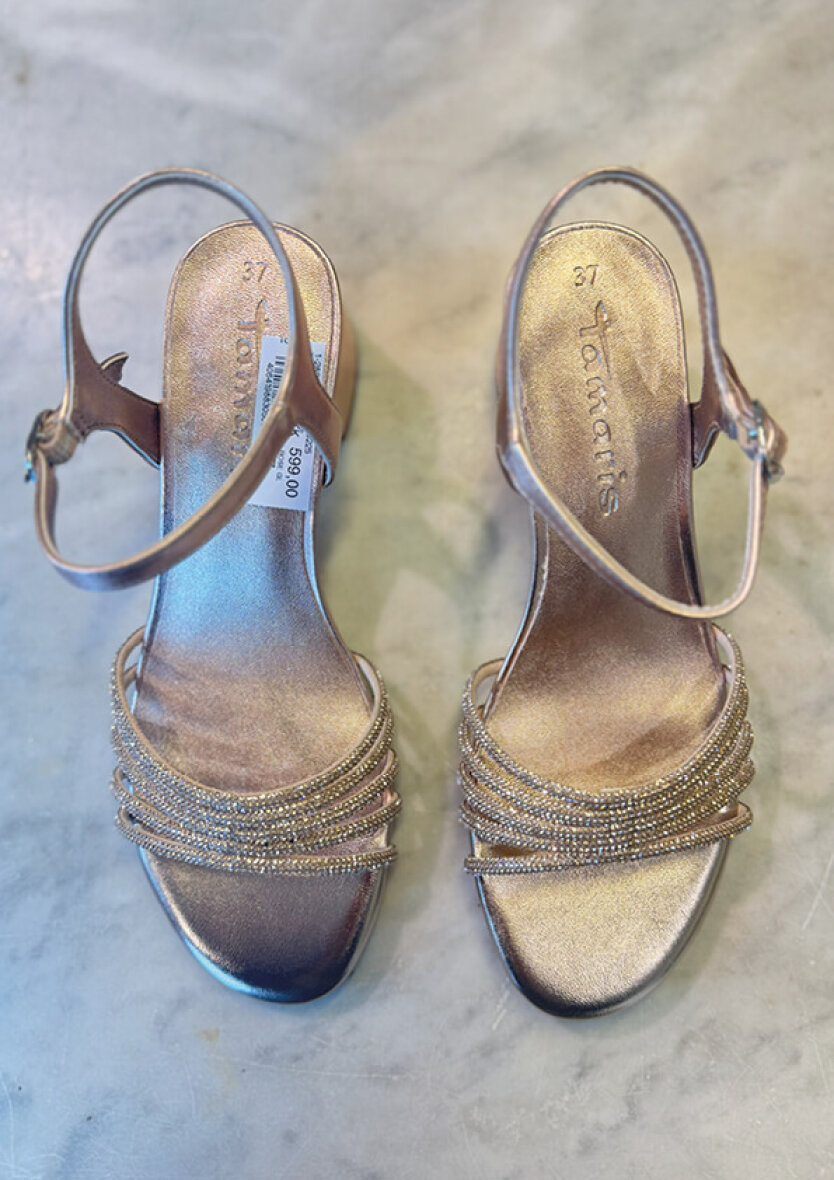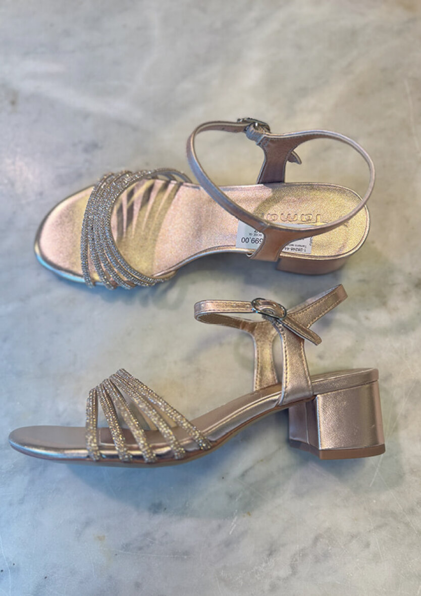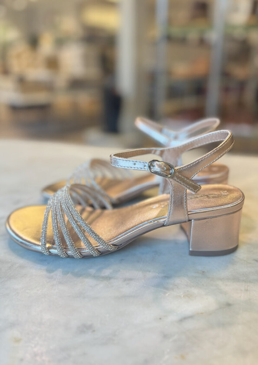 En flot og iøjefaldende sandal som pifter ethvert outfit op. Den glitrende højhælede sandal er perfekt til festlige arrangementer.