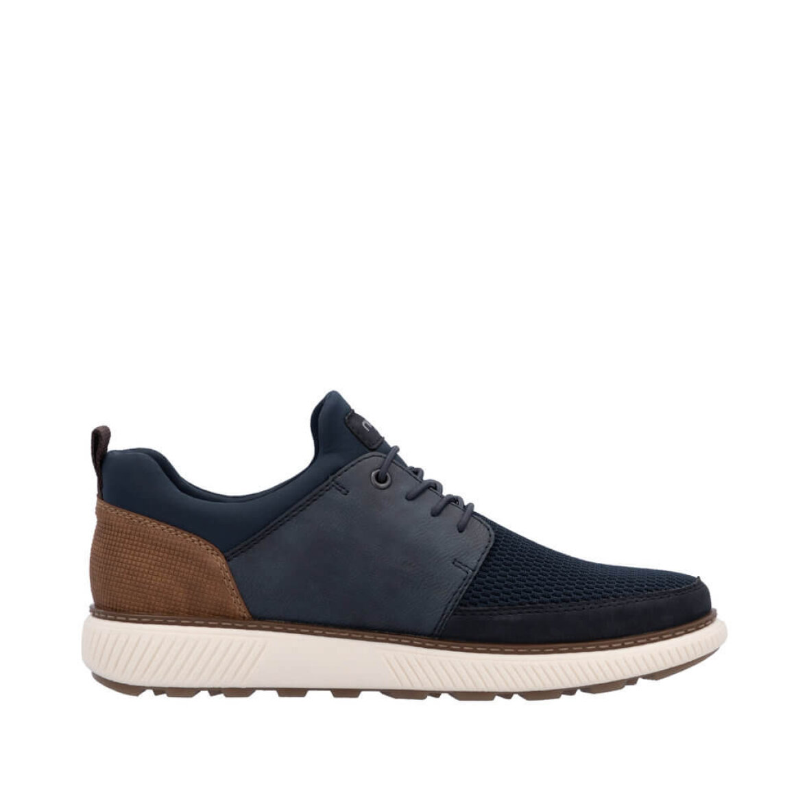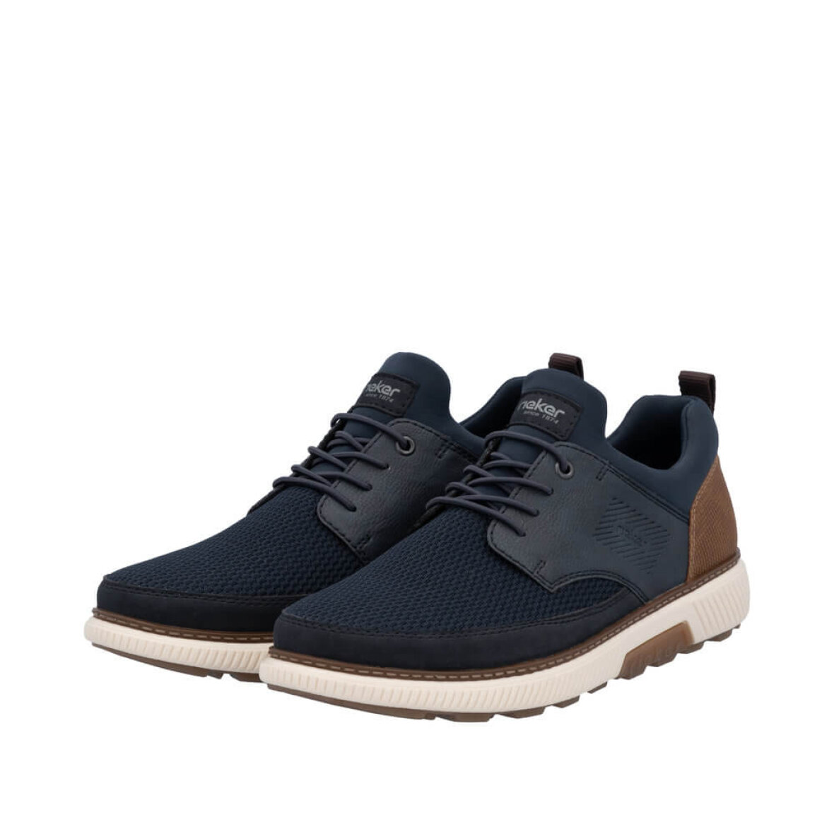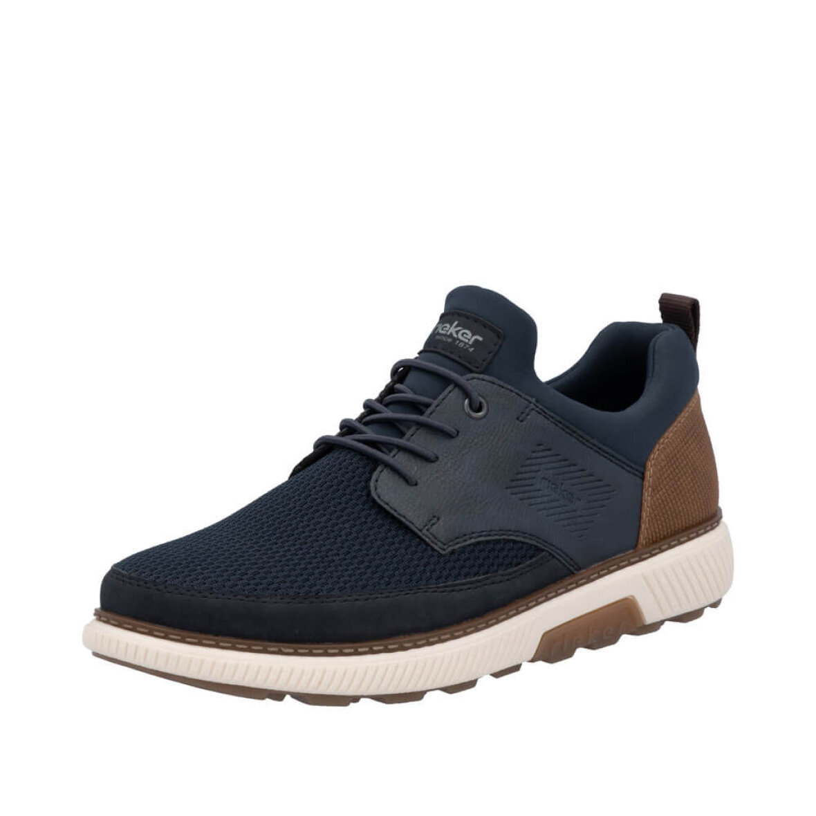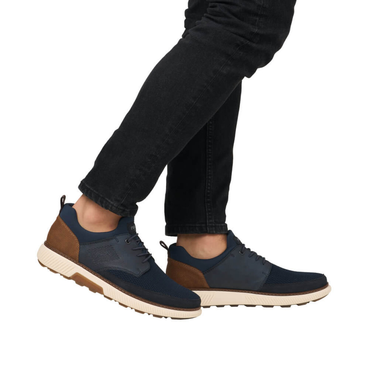 Elegant navy Rieker sko til herre med fine brune detaljer.