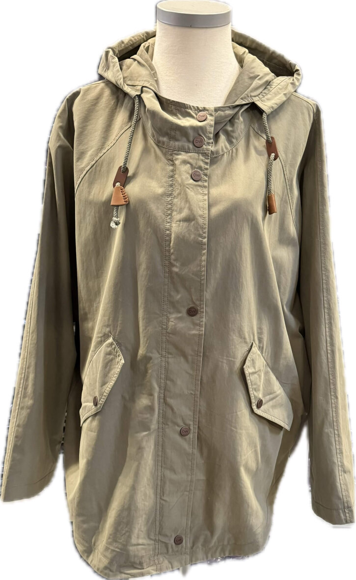 Jakken er lavet med gennemgående lynlås og knapper langs fronten, som kan lukkes højt op ved halsen, for beskyttelse mod vinden. Jakken er tilmed med hætte, som kan spændes ind ved hjælp af stropper med smarte brune skind detaljer. Med to praktiske lommer med knapluk samt en inderlomme med knaplukning