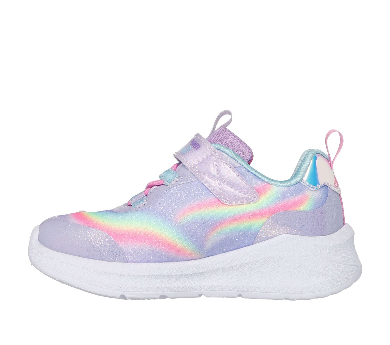 Super flot pige sneakers fra Skechers i modellen S-Lights: Unicorn Chaser. Disse børne sneakers er lavet med en overdel i syntetisk glimmerfinish med et kreativt enhjørning- og regnbue motiv på siden.