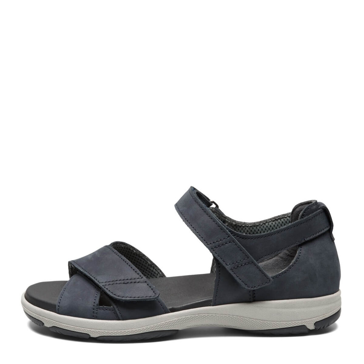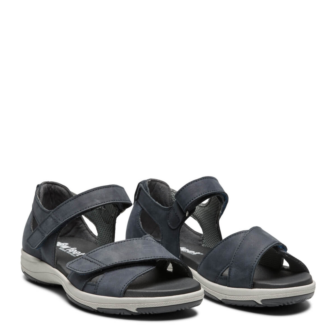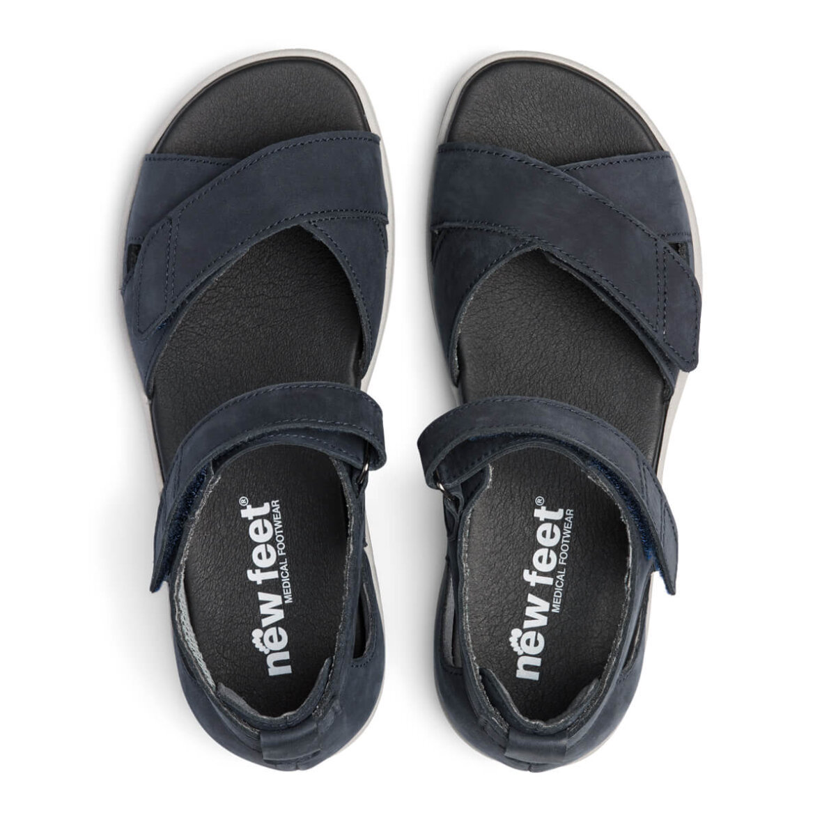 Komfortabel sandal fra New Feet i et flot navy design udført i olieret nubuck. Sandalen er med to kryds remme over forfoden, hvor den ene kan reguleres med velcro samt en ankelrem med velcro luk, så sandalen kan tilpasses til netop din fod. Sandalen er tilmed med hælkappe, som giver dig den bedst mulige stabilitet.
