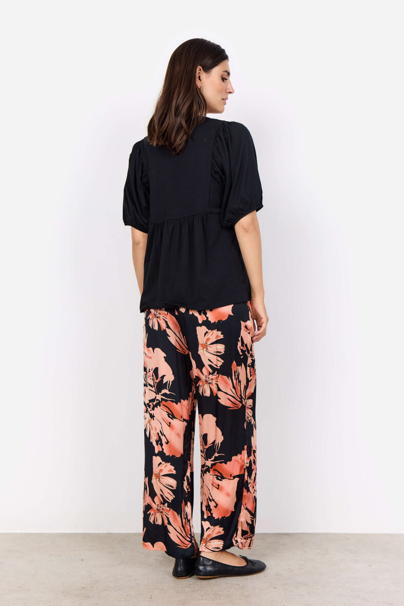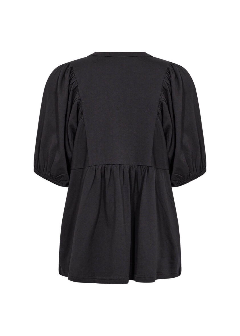 Blusen er med rund hals med en lille v-halsudskæring. Den sorte bluse er lavet med overskæring under brystet, som giver en flot og flatterende facon. Blusen er med korte ærmer, som afsluttes med elastik kant, som giver en flot ballon effekt til ærmet. Blusen er lavet i en afslappet pasform i en let og luftig kvalitet af 100% økologisk bomuld.