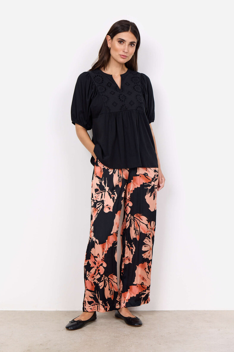Fin og feminin bluse fra Soyaconcept i et sort design med smukke broderi anglaise detaljer foran.