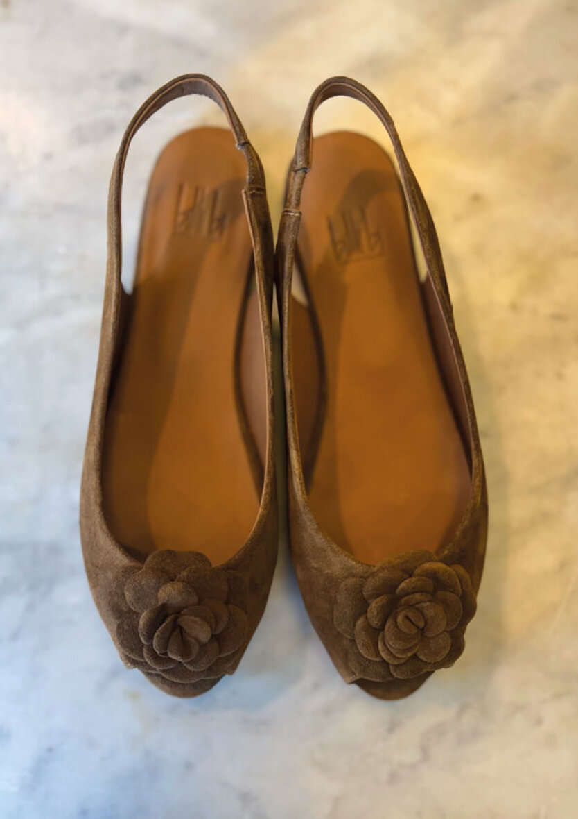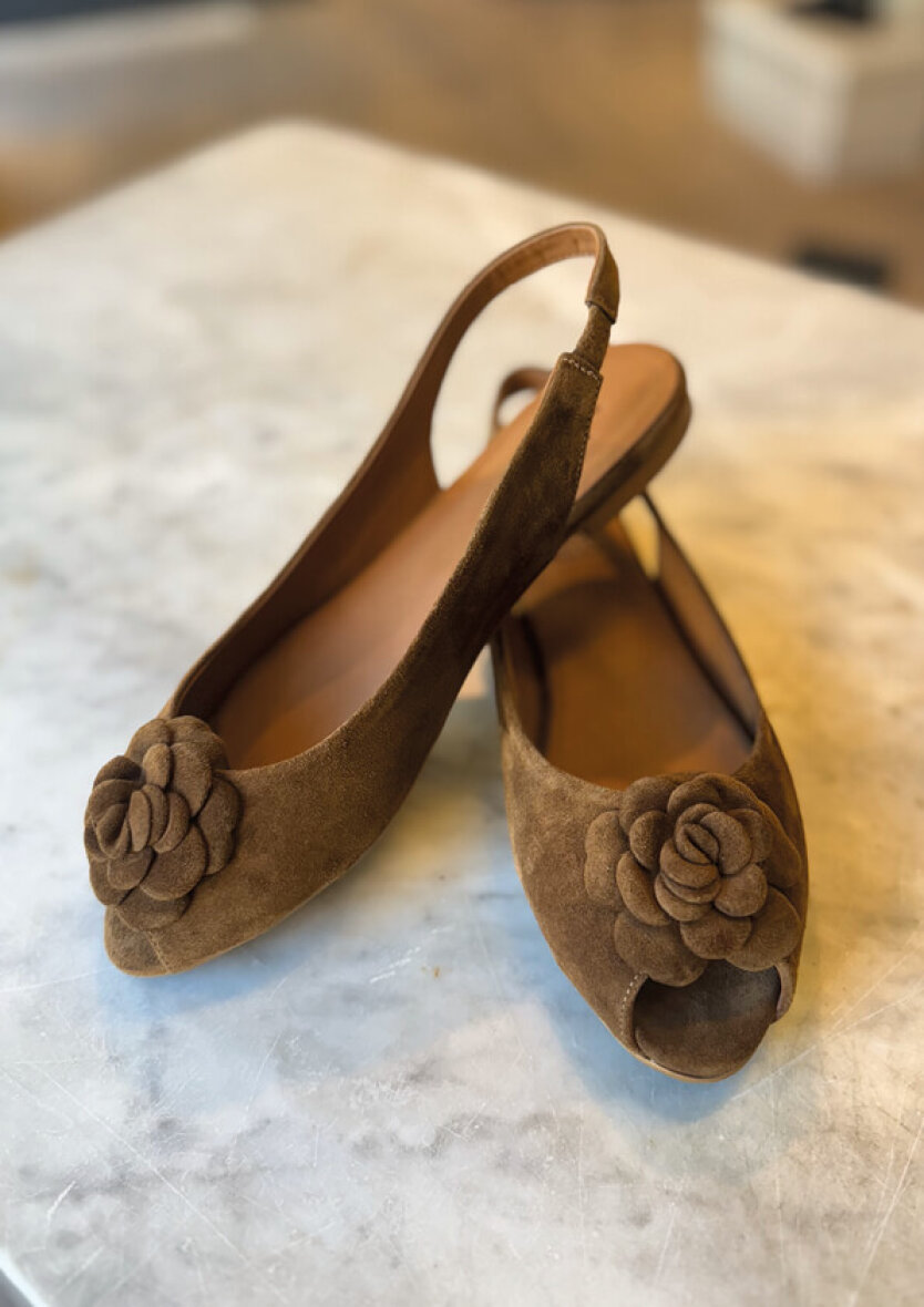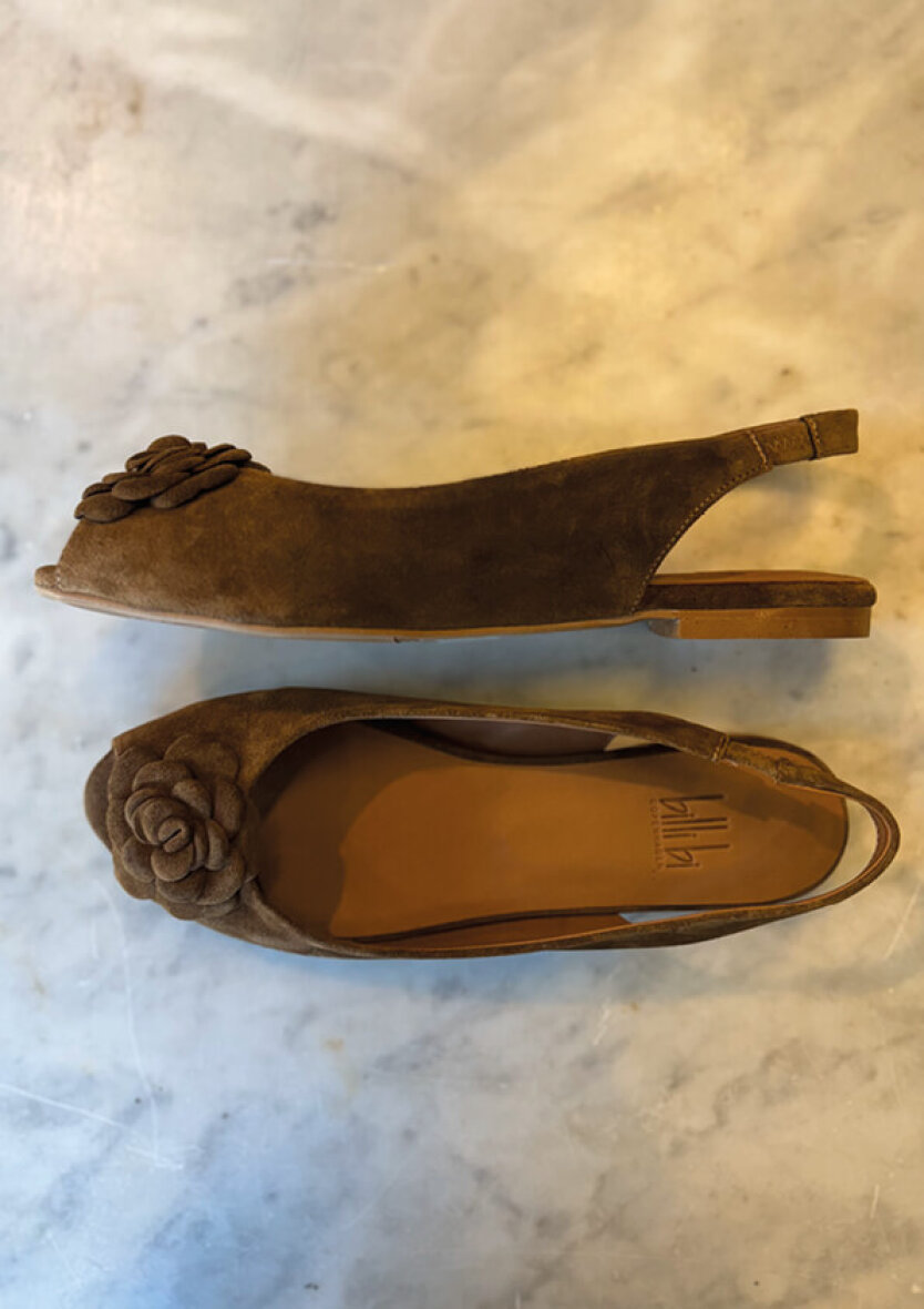 Feminin håndlavet brun slingback ballerina fra Billi bi. Ballerinaen er udført i cognac-farvet ruskind med en flot og dekorativ blomst, som tilføjer et elegant touch.