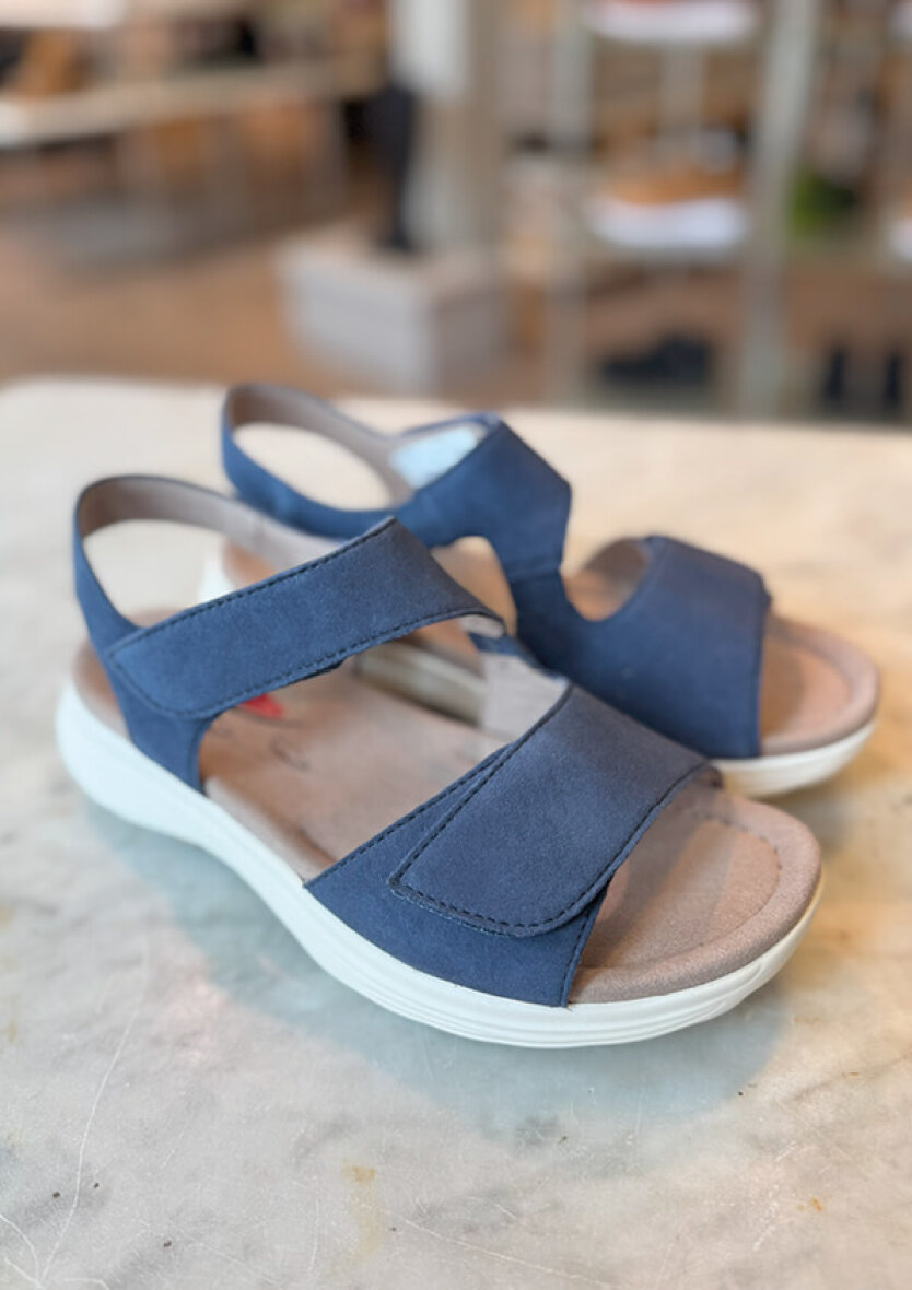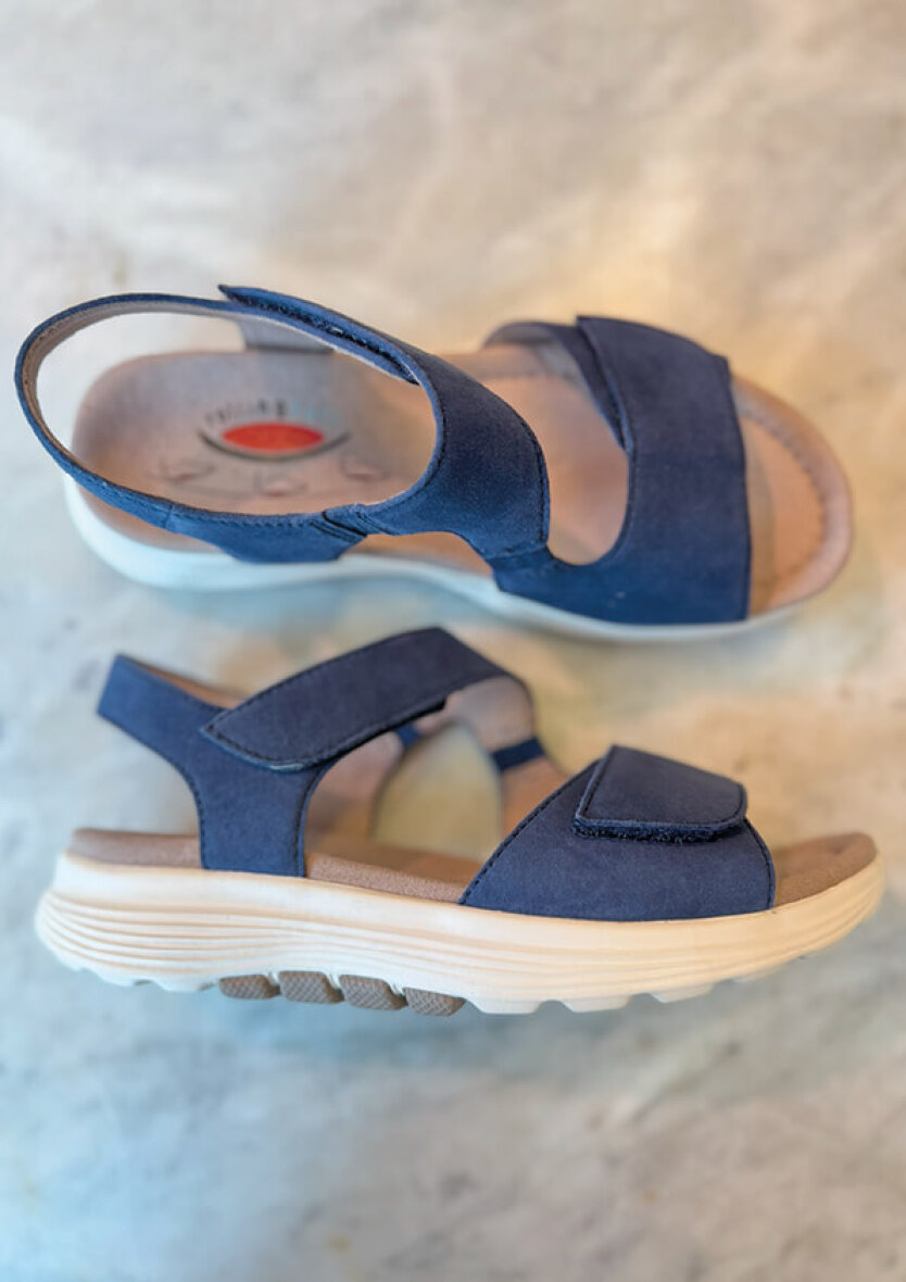 Klassisk og sporty Rollingsoft sandal fra Gabor. Sandalen er udført i mørkeblå ruskind på overdelen med en sporty lys ydersål i gummi. Sandalen er med to remme og kan begge reguleres med velcroluk, så den nemt kan tilpasses foden. Sandalen er også lavet med rem om hælen, som giver en god stabilitet.