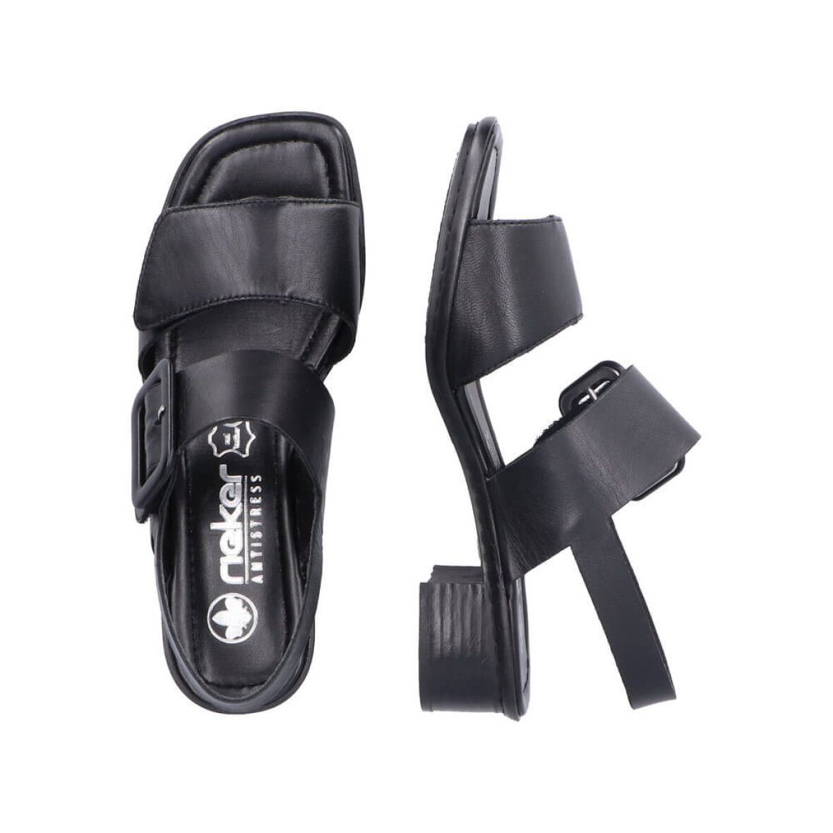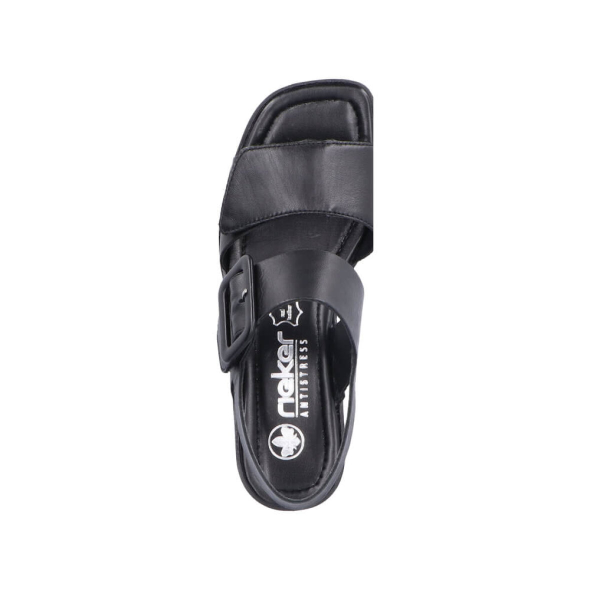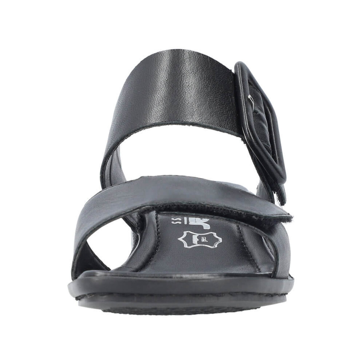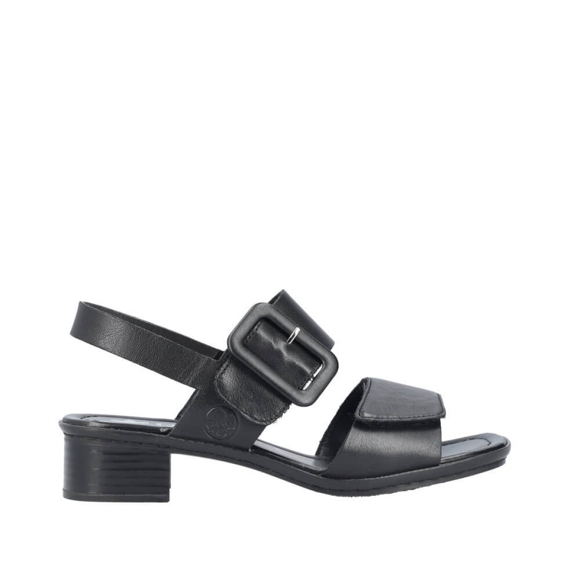 Fin og elegant sort sandal til kvinder fra Rieker. Overdelen er lavet i en blød skind kvalitet.