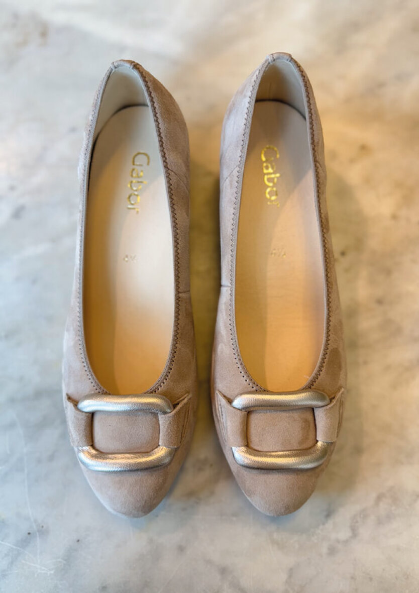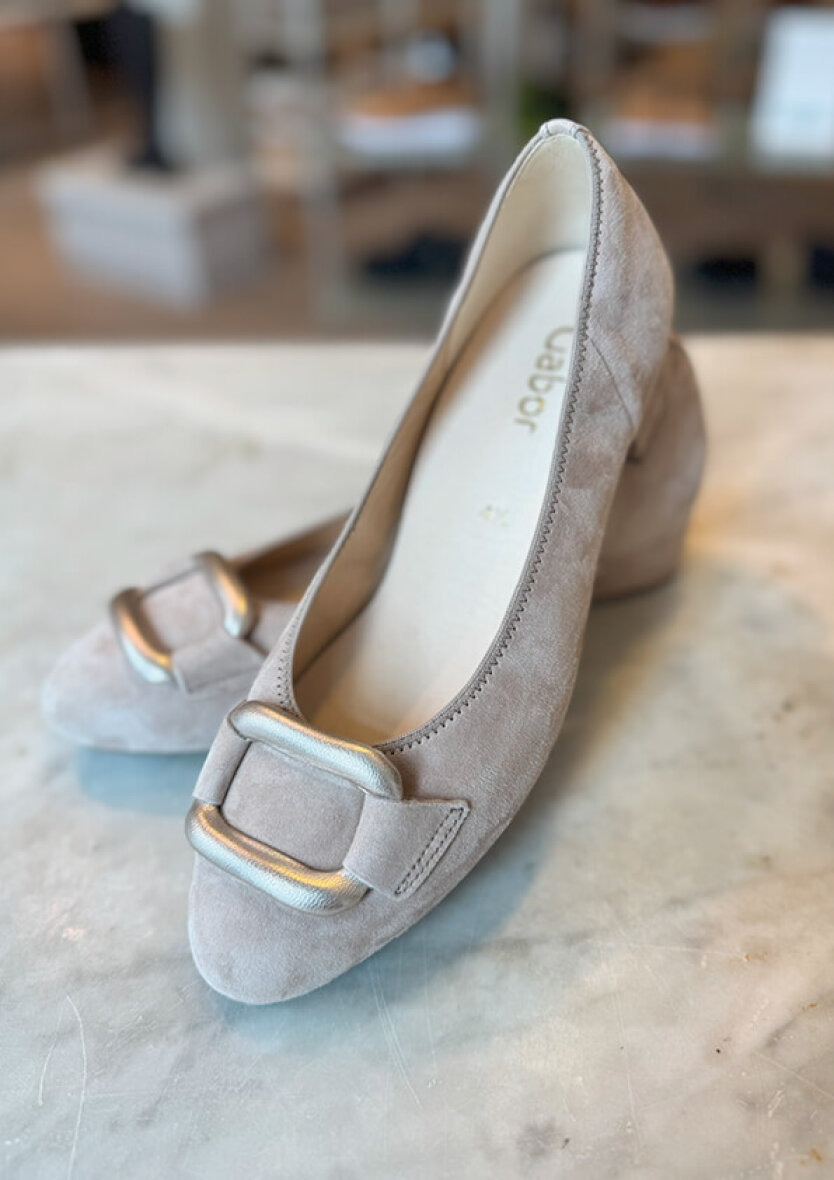 Den højhælede sko er lavet i ruskind med en dekorativ sølv spænde. Denne pump har almindelig vidde F og har Gabors Optifit udtagelig indlægssål, så der evt. er plads til egne speciallavede såler.