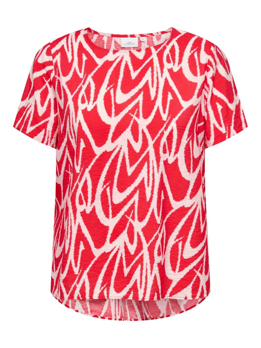 Fin og farverig kortærmet bluse fra ONLY Carmakoma i et rødt og hvidt mønstret design.