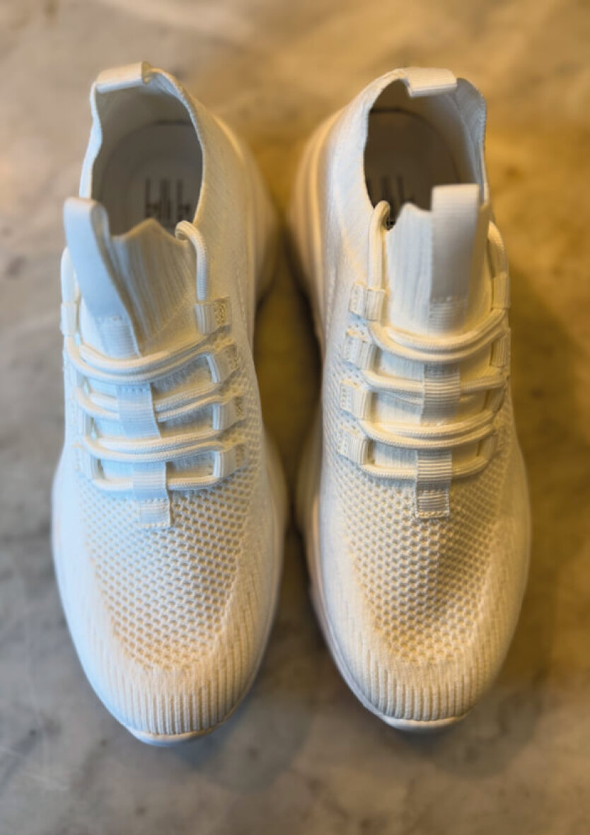 De hvide sneakers er lavet med en strop fortil og bagtil, så de er letter at få af og på. Den sporty ydersål er lavet i gummi med et dekorativt mønster. Disse Billi bi letvægt sneakers er lavet i fly-knit tekstil, som sikrer god åndbarhed. Hælhøjde 3 cm.