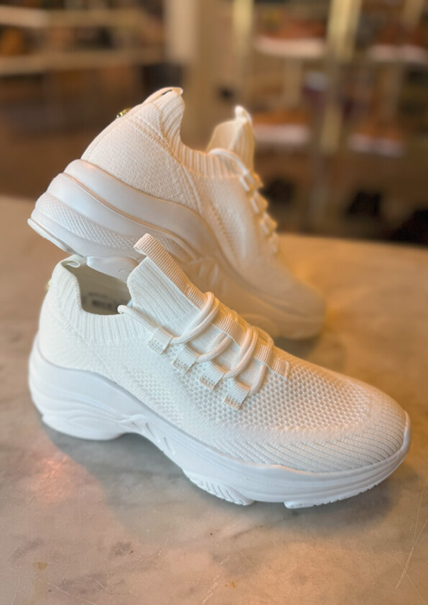 Smarte håndlavede hvide sneakers fra Billi bi i et klassisk sporty design. Disse sneakers er udført i hvidt fly-knit tekstil med hvide snørebånd.