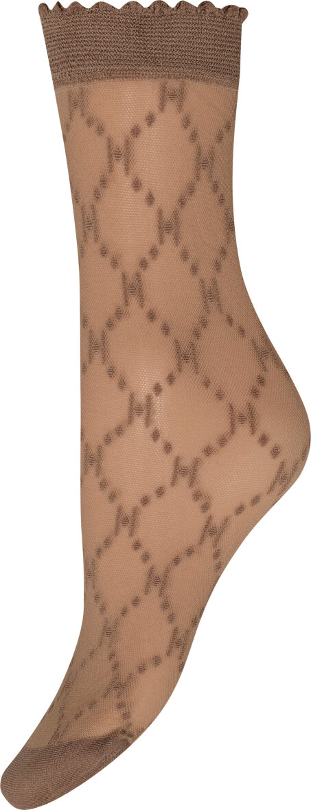 Flotte strømper i transparant nylon med logo tryk. Strømpen er i nude farvet bund med det klassiske HYPE logo i sandfarvet tern samt matchende sandfarvet kant øverst og ved tæerne.