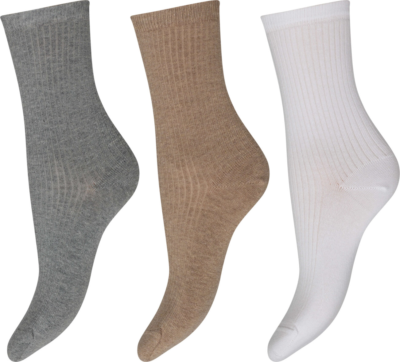 3-pakken inkluderer strømper i farverne: hvid, brun og grå.