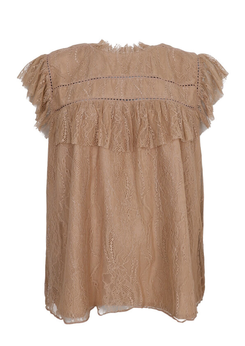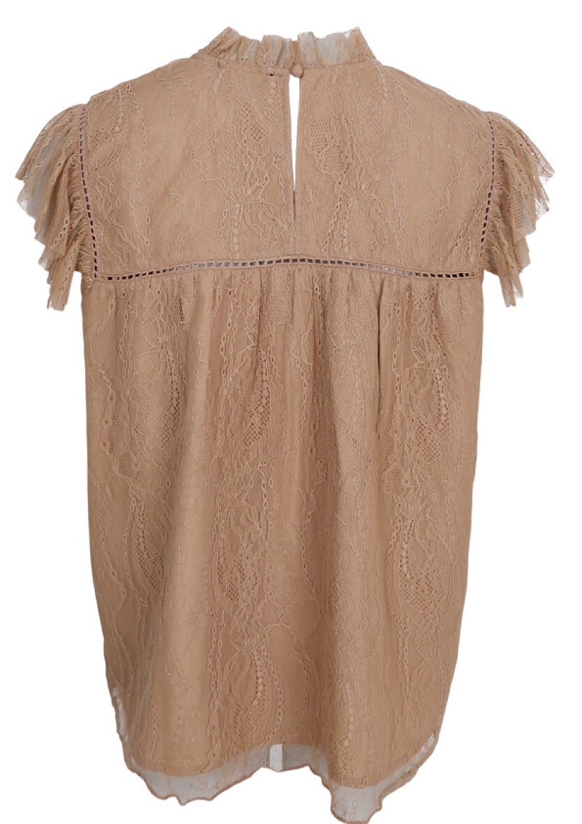 Blusen er lavet med rund hals med fine blonde detaljer, som går igen ved ærmerne og giver et elegant og feminint look. Blusen er uden ærmer for et let og sommerligt look. Blusen er tilmed dekoreret med smukke broderings detaljer.