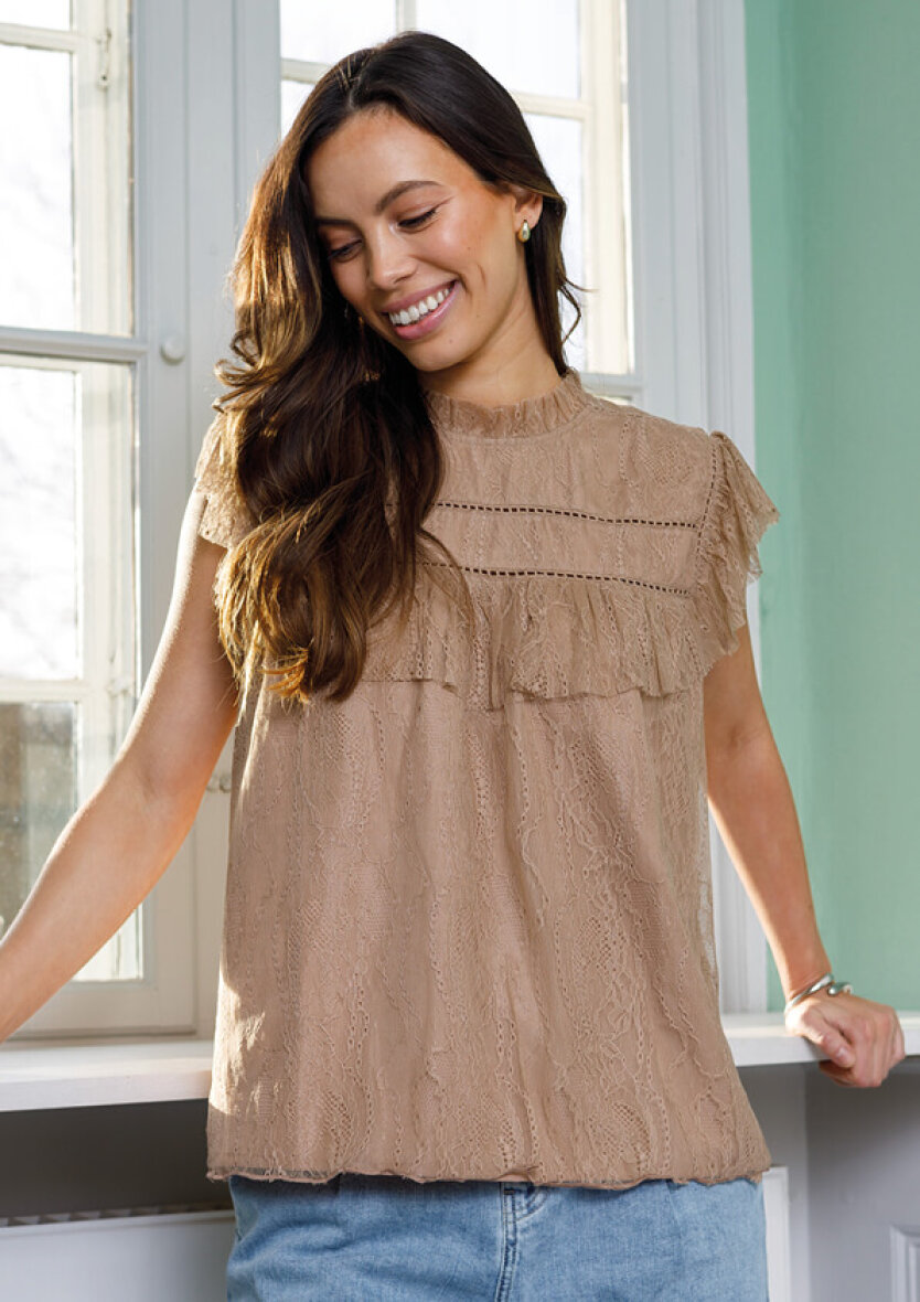 Denne smukke brune bluse med feminine blonde detaljer egner sig perfekt til sæsonens fester.