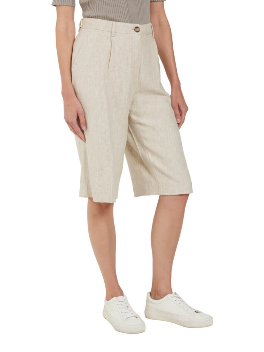 Smarte bermudashorts i et fint sandfarvet hør design fra Brandtex. Disse shorts er ekstra lange og med vidde samt læg foran, som giver et elegant look.