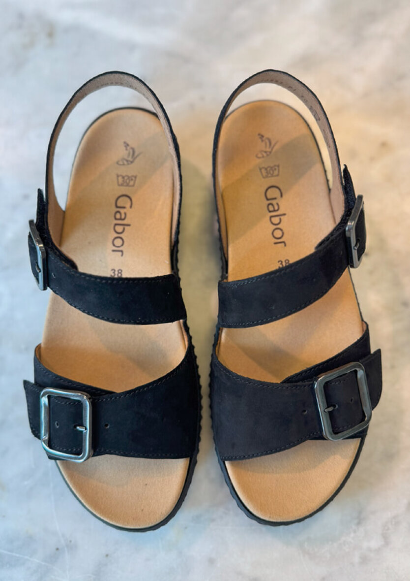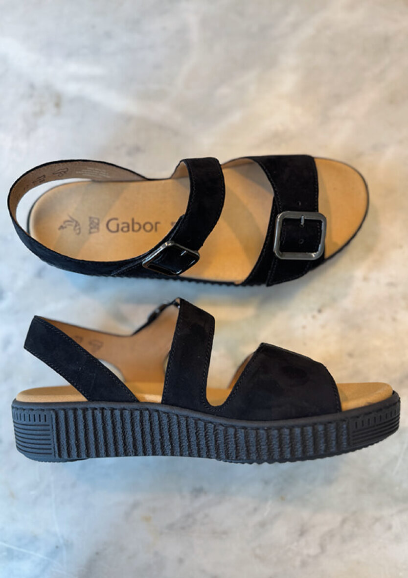 Flot sort sandal fra Gabor i et enkelt design med to velcroremme over forfoden.