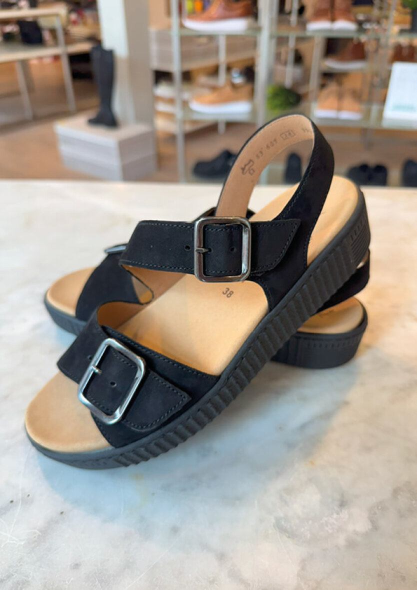 Den komfortable sandal er med en udtagelig Optifit indlægssål, som tilmed også kan vaskes. Sandalen har normal vidde og er udstyret med Gabors Best Fitting med et par ekstra millimeter i forfoden. Ydersålen er en sort chunky gummisål med kile på 2 cm.