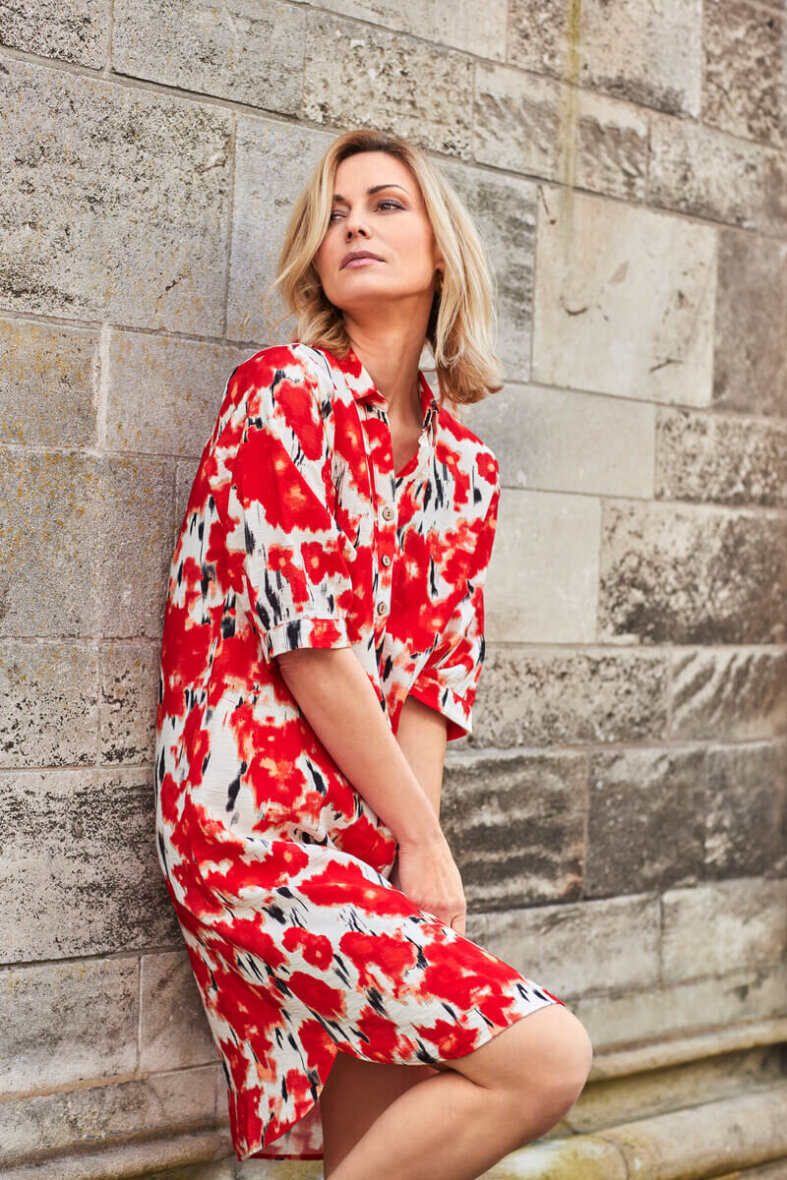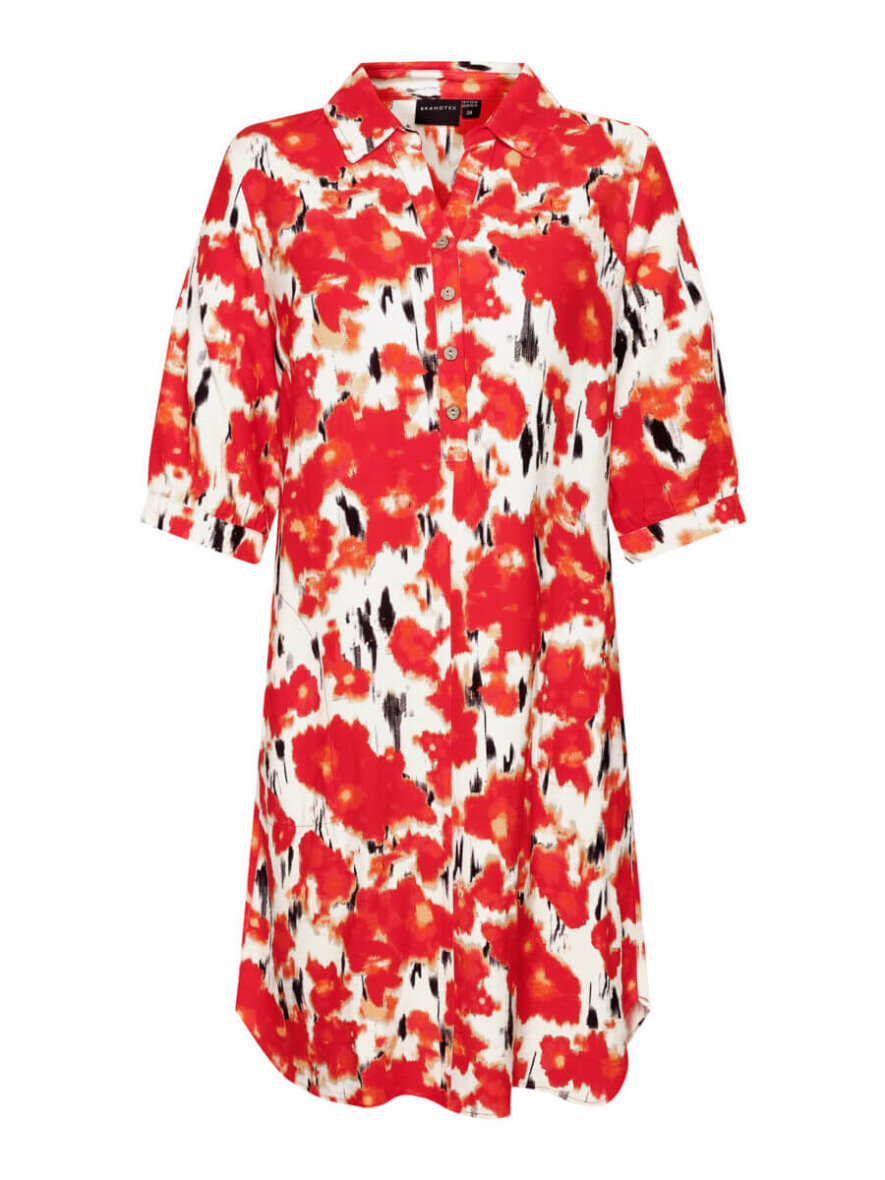 Flot og farverig kjole fra Brandtex i et smukt mønster i røde nuancer - Perfekt til sæsonens fester.