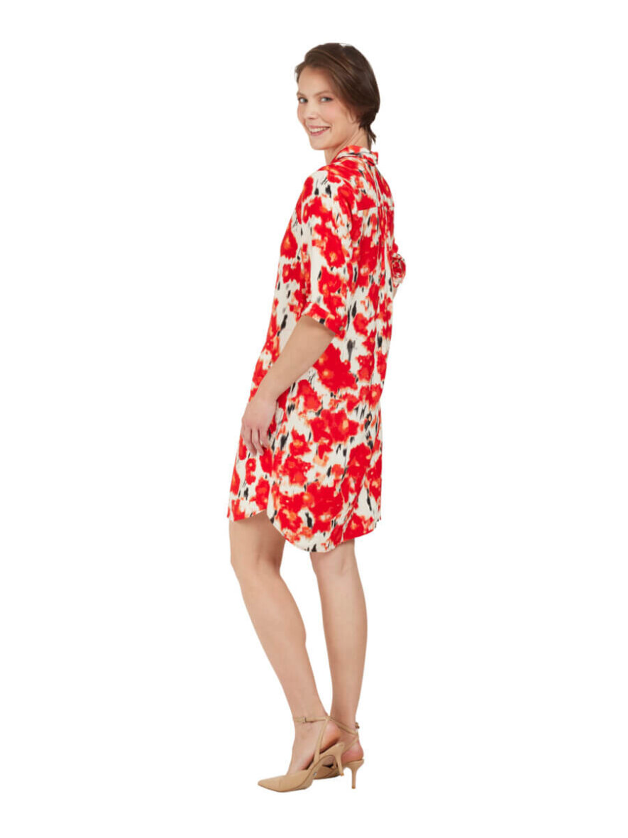 Kjolen er med krave og en lille v-halsudskæring, hvorfra kjolen lukkes med 4 dekorative knapper, som afsluttes med stolpeluk. Den mønstrede kjole er med halv lange ærmer med manchet knap. Kjolen er lavet i et knælangt design i en afslappet pasform med et lille slids i siderne. Med skjulte lommer i siderne.