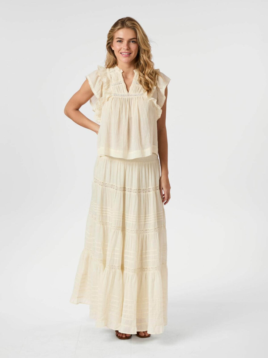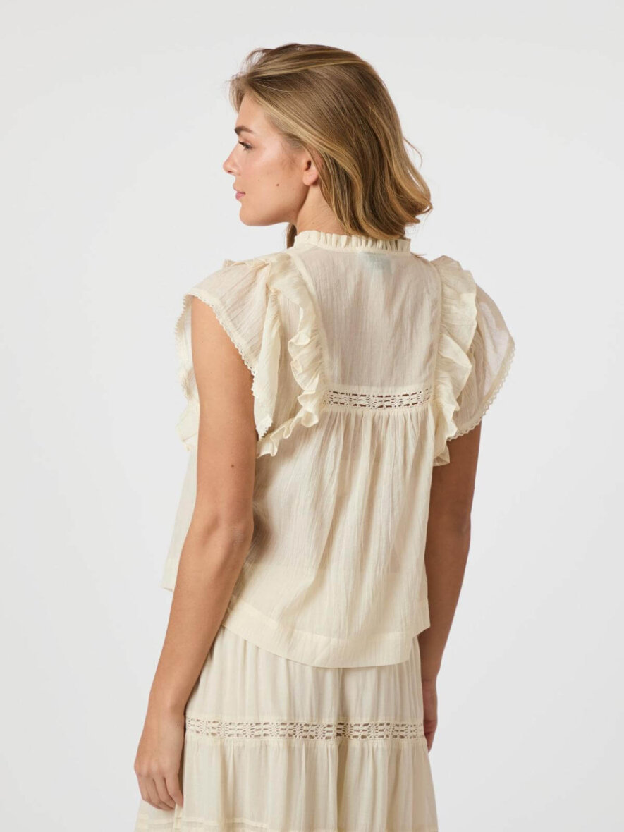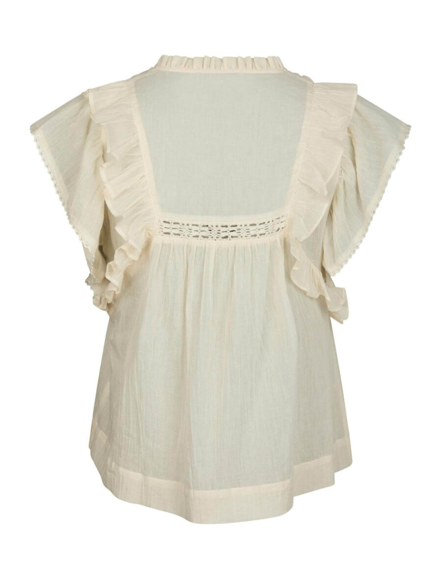 Blusen er lavet med fine feminine detaljer. Langs fronten har blusen flotte flæser og blonde detaljer. Blusen er uden ærmer og med en v-halsudskæring. Blusen har en løs pasform og er lavet i en lækker kvalitet i 100% bomuld.
