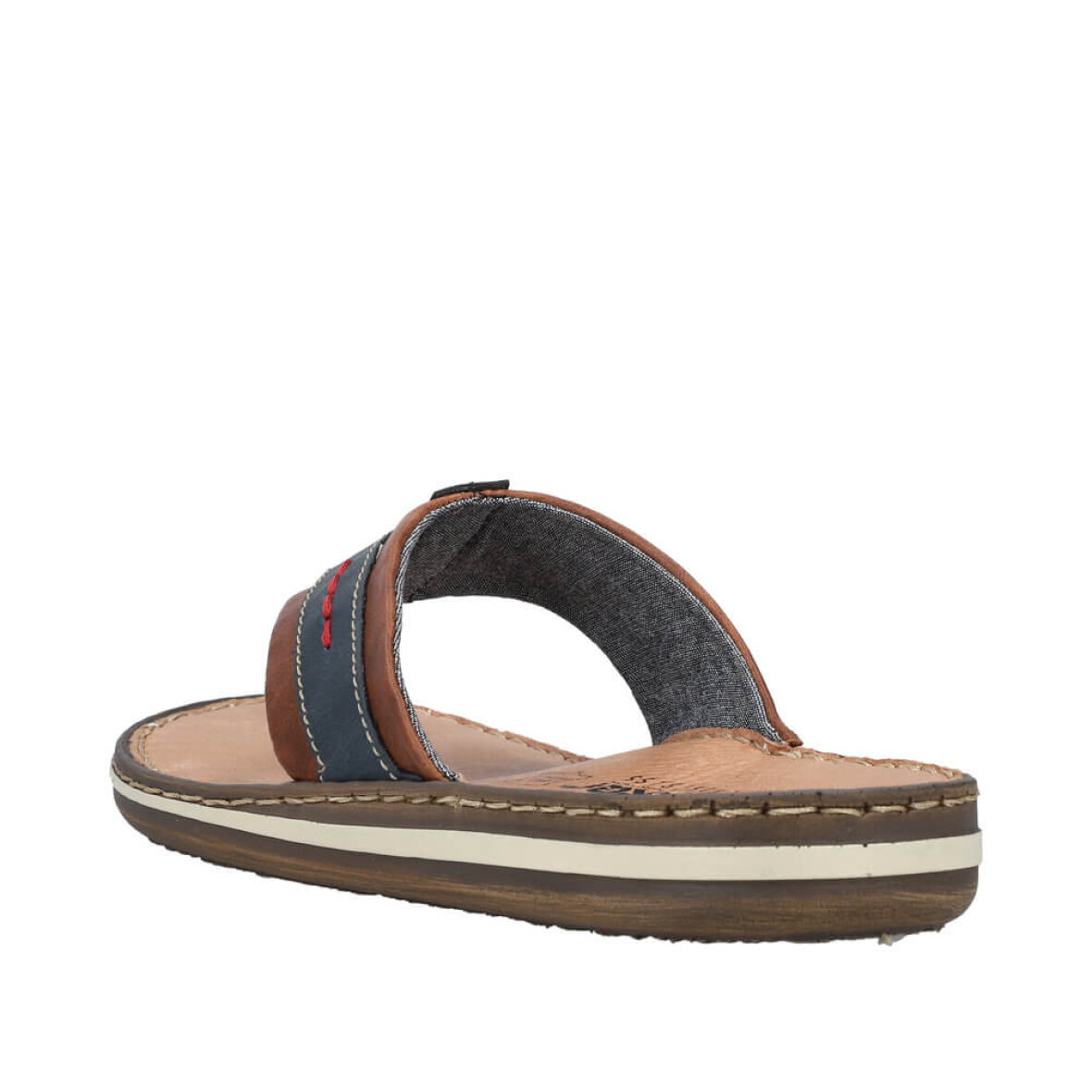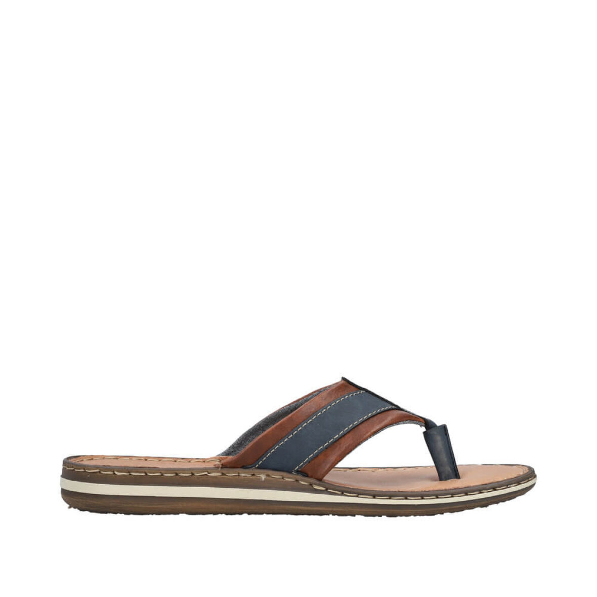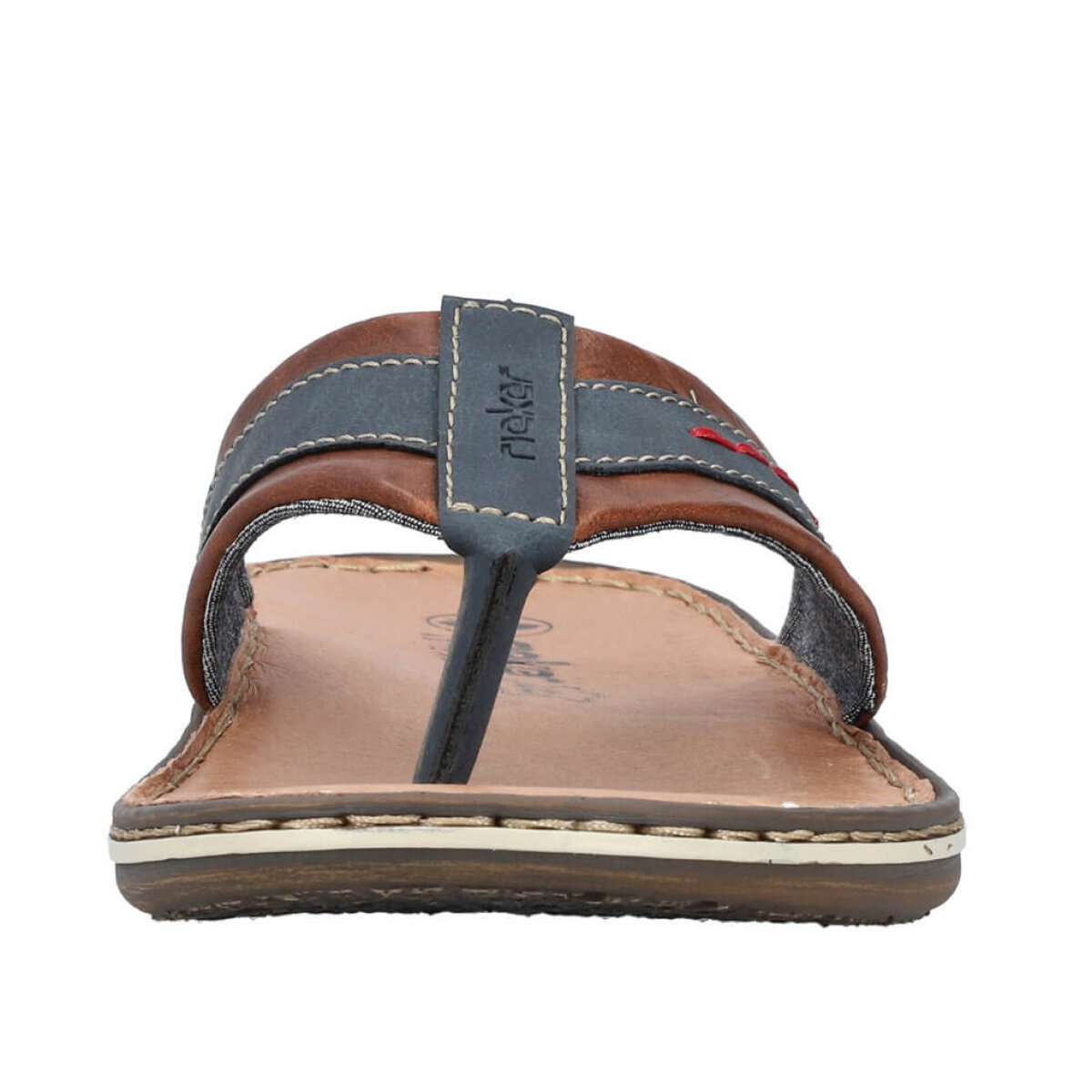 Smart herre sandal med tå rem fra Rieker i et mørkeblåt design med smarte brune skind detaljer.