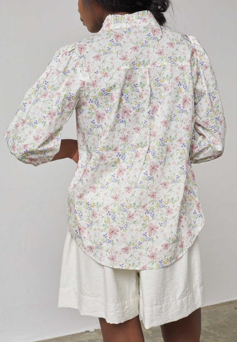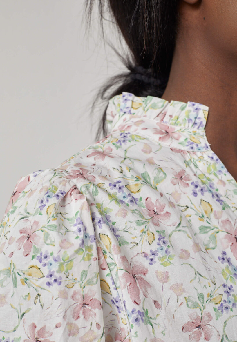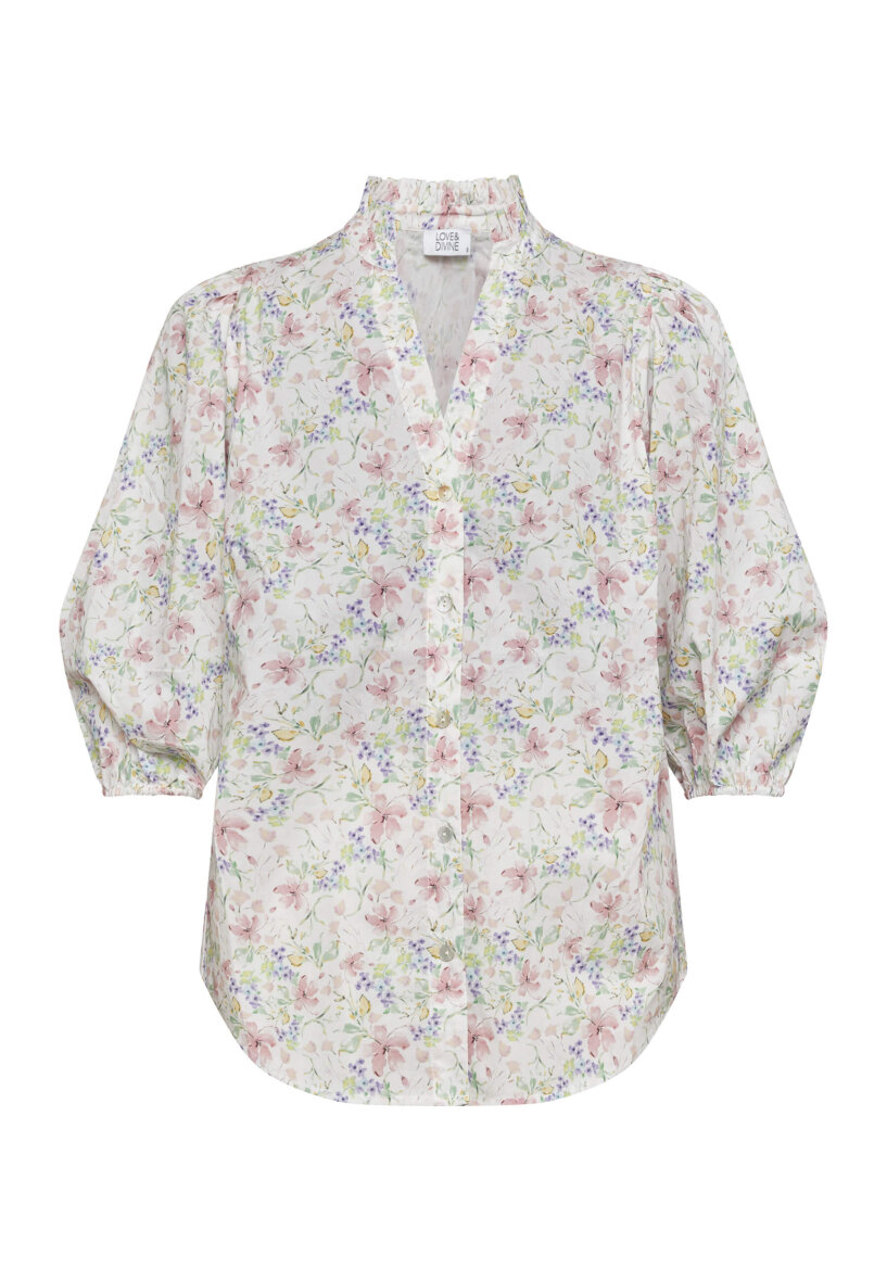 Fin hvid skjorte i et feminint og farverigt blomsterprint fra Love & Divine. Det smukke blomster print er lavet i et mix af lyserøde, gule, lilla og grønne farver.