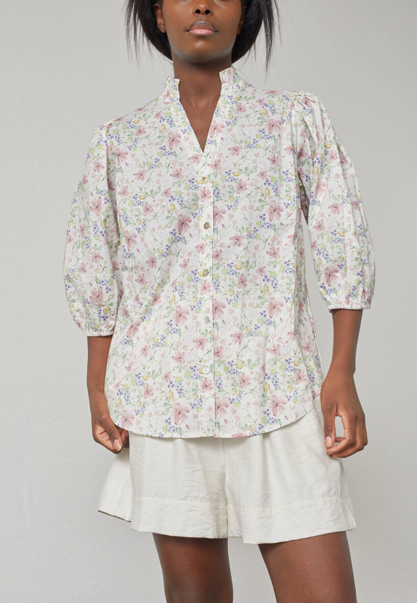 Skjorten har kinakrave og v-halsudskæring, hvorfra skjorten lukkes med gennemgående knapper. Skjorten er lavet med 3/4 lange pufærmer, som afsluttes med elastik kant. Let afslappet pasform med en fin runding forneden.