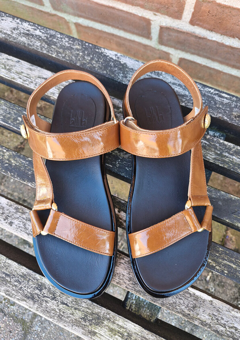 Elegant brun sandal fra Billi Bi. Sandalen er lavet i glat brun skind med en overflade behandling som giver et shiny udtryk. Sandalen er med en dekorativ guld knap på den ene rem, hvilket giver et elegant udtryk.