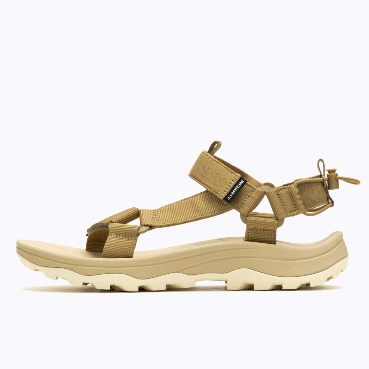 Sandalen er med enkle tekstil stropper på overdelen, som kan justeres både foran og bagpå. Farven er er lavet i en alsidig beige / khaki farve med matchende ydersål.