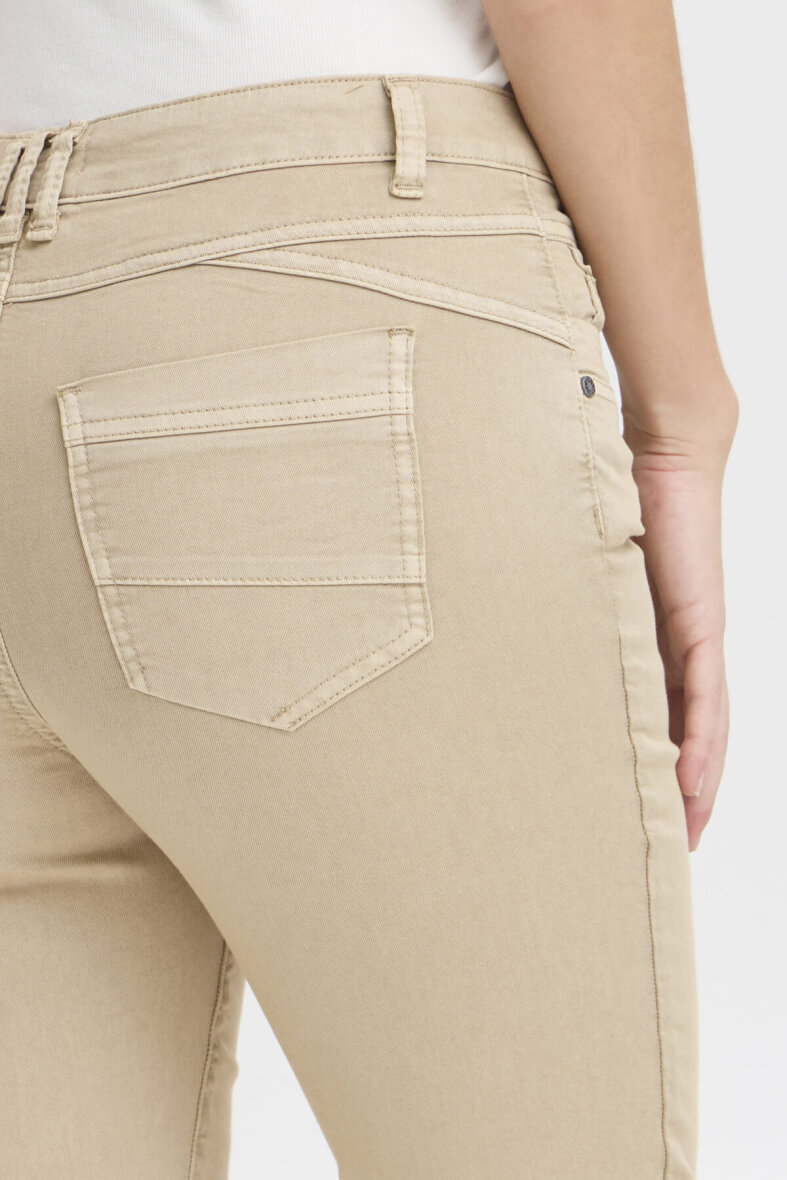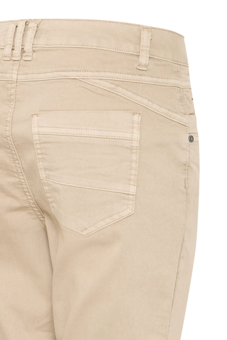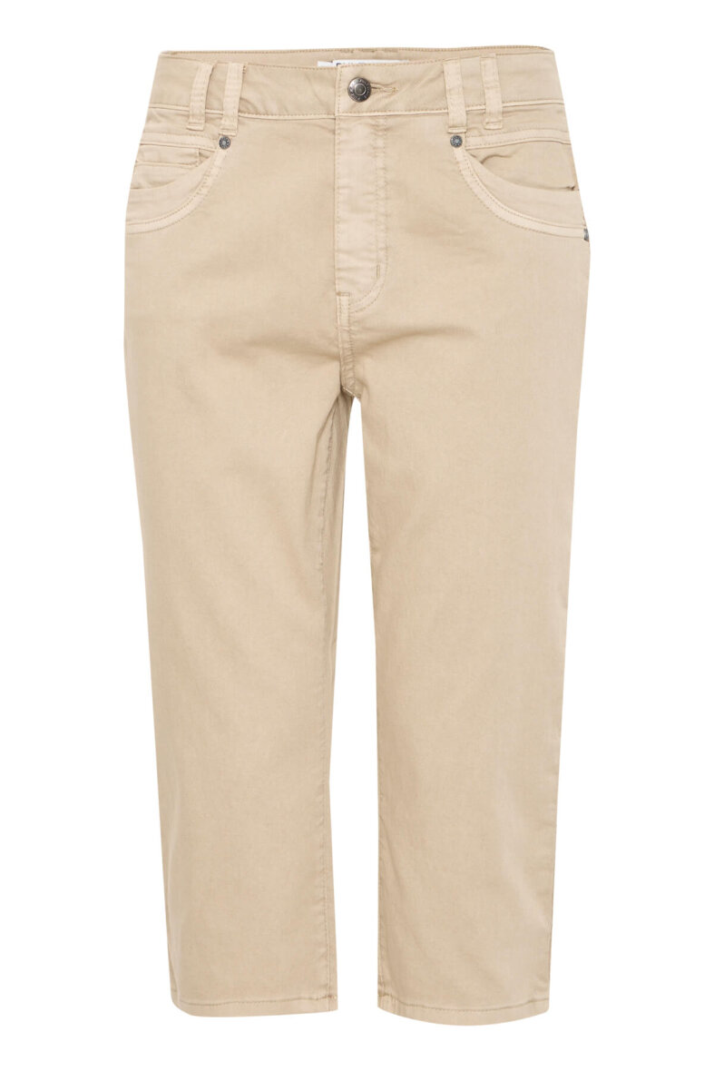 Bukserne er lavet i en såkaldt piratbuks, som passer perfekt i de varme måneder. Buksen er lavet i et klassisk jeans design med knap- og lynlåsluk foran, bælte stropper og 5-lommer. De sandfarvede capri bukser er lavet i et højtaljet fit med en masse stretch i materialet.