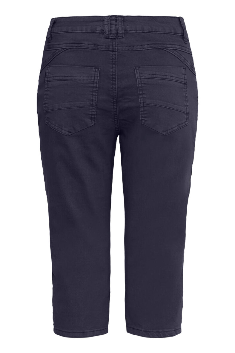 Buksen er lavet i et klassisk jeans design med knap- og lynlåsluk foran, bælte stropper og 5-lommer. De mørkeblå capri bukser er lavet i et højtaljet fit med en masse stretch i materialet.