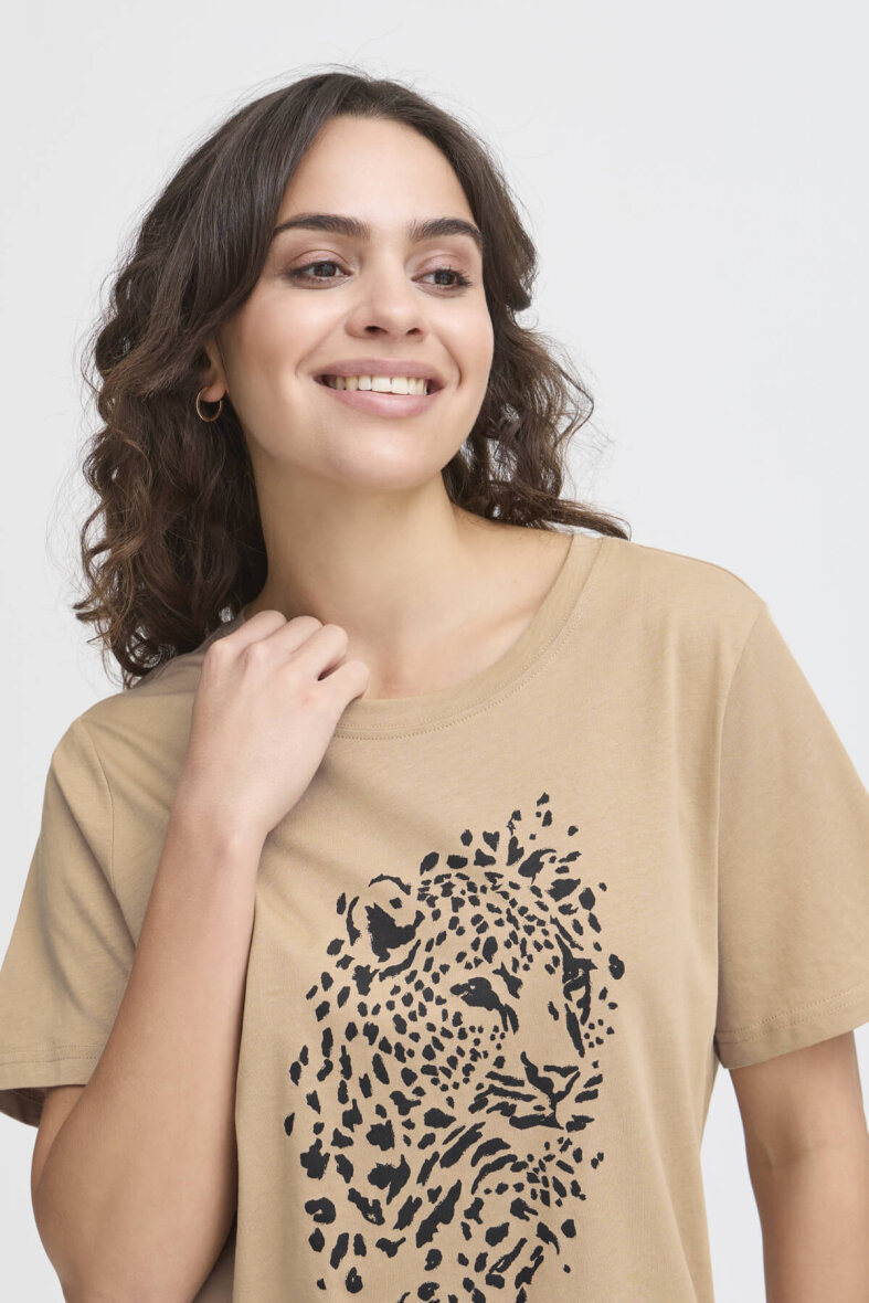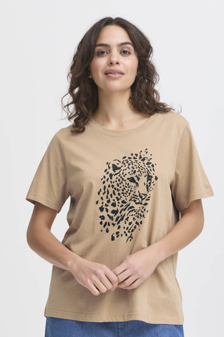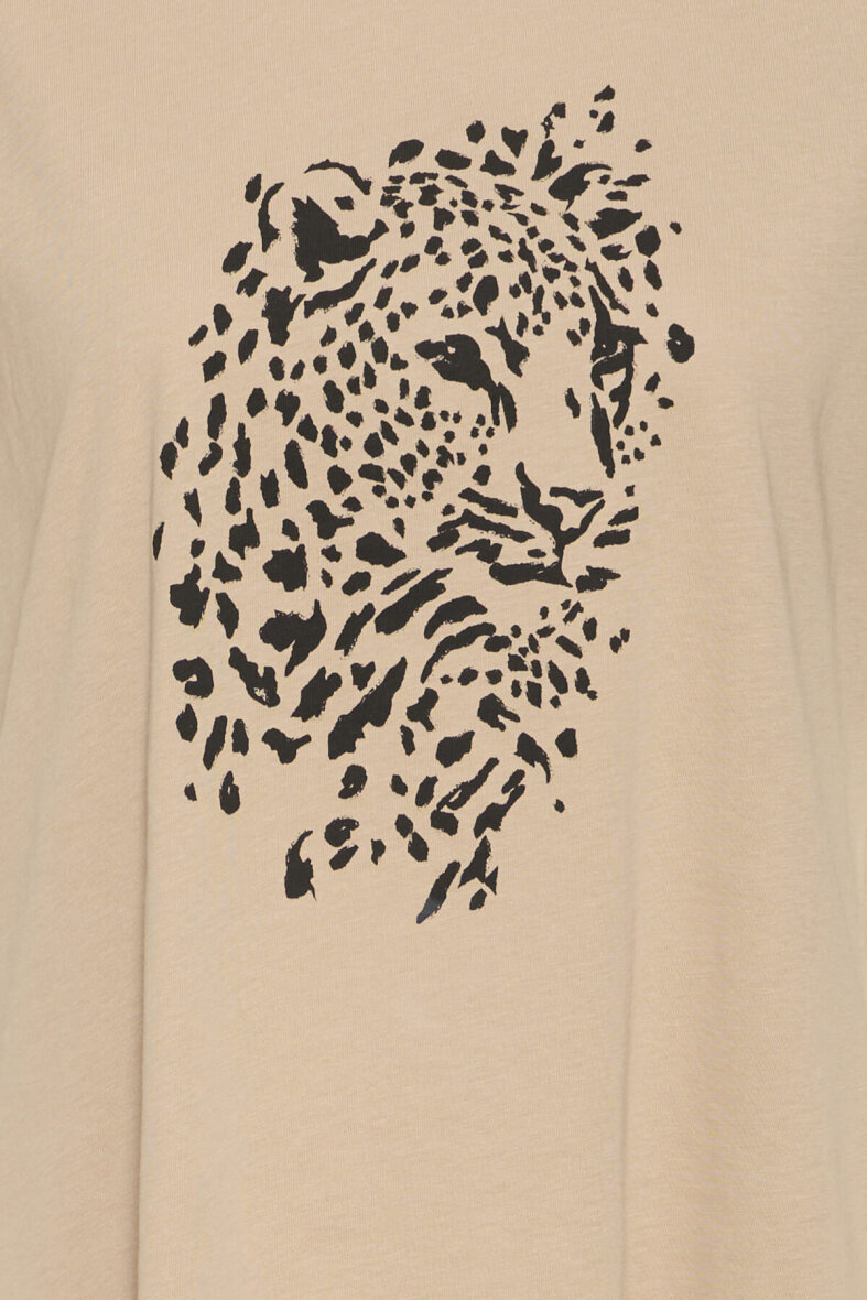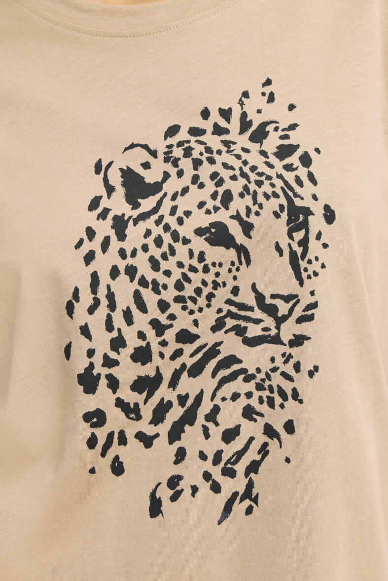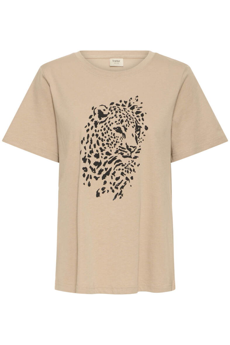 Smart sandfarvet t-shirt fra FRANSA med et sort leopard motiv på fronten. Enkelt design, som er let at style til det meste.