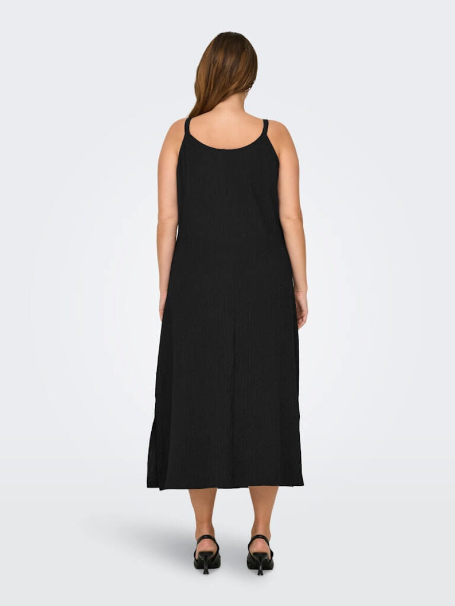 Kjolen er lavet i et klassisk sort design med rund hals og smalle stropper. Den sorte kjole er lavet i en afslappet pasform i et langt fit med slids i siderne.