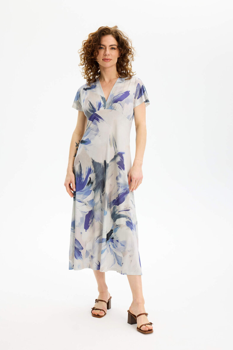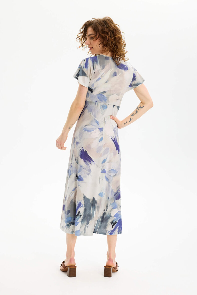 Kjolen er lavet i en dejlig blød polyester kvalitet med stretch, som er yderst behagelig at have på. Den mønstrede kjole er med v-halsudskæring og korte ærmer samt en overskæring ved brystet, som tilføjer et feminint snit.