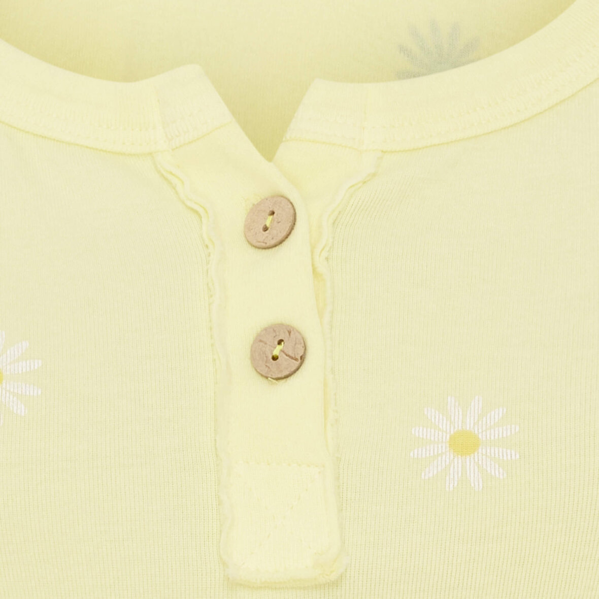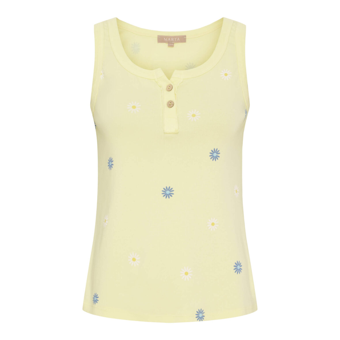 Toppen er lavet i en lækker blød bomuldskvalitet med stretch. Den gule top er med rund hals og brede stropper. Toppen er to træknapper ved halsåbningen, som afsluttes med stolpeluk.