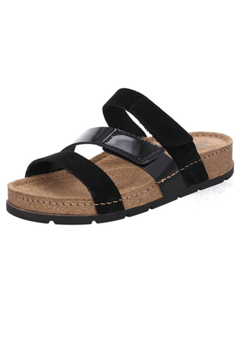 Fine slipper sandaler med lille kilehæl fra Rohde i et klassisk sort design med 3 remme, hvoraf den ene kan justeres med vecro.