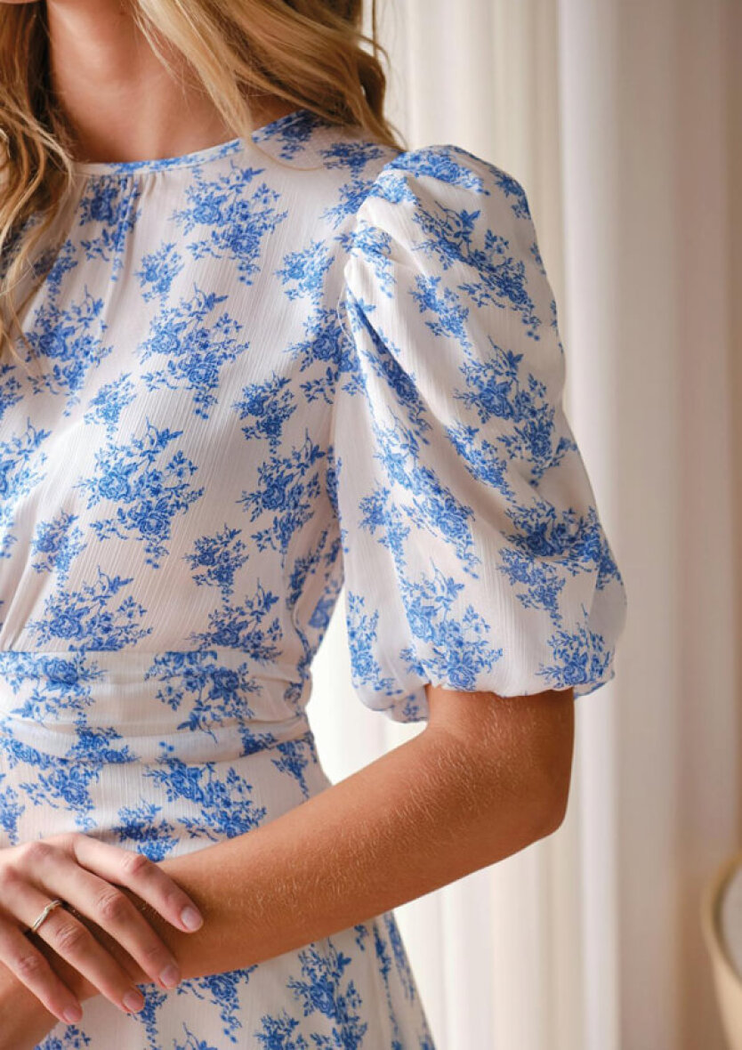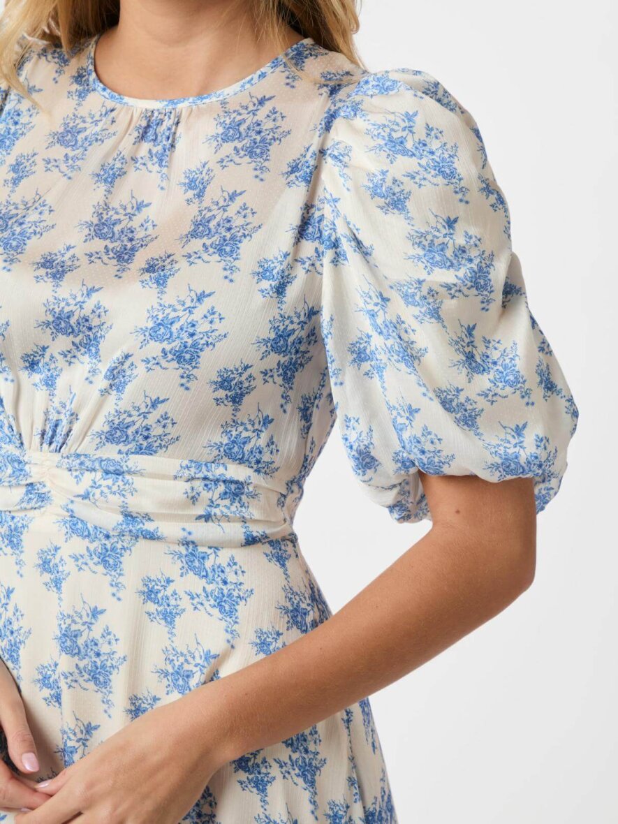 Den blomstrede kjole er med rund hals og korte pufærmer. Kjolen er lavet med et flot og elegant talje snit med smock bag på, som giver en flatterende silhuet. Med påsyet hvid underkjole.