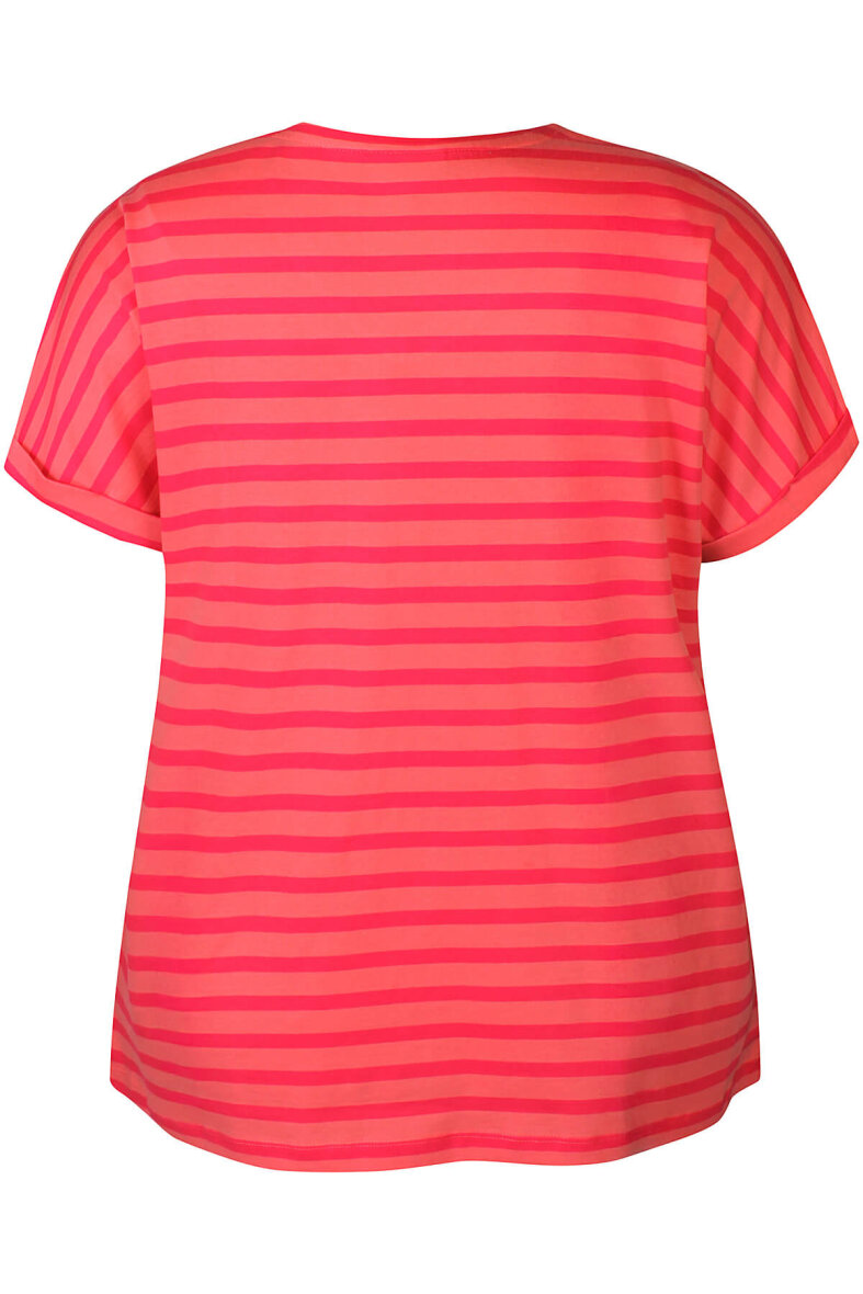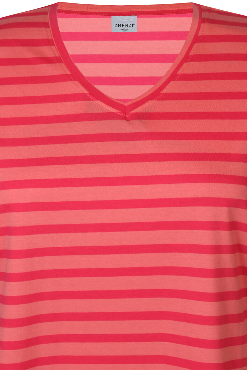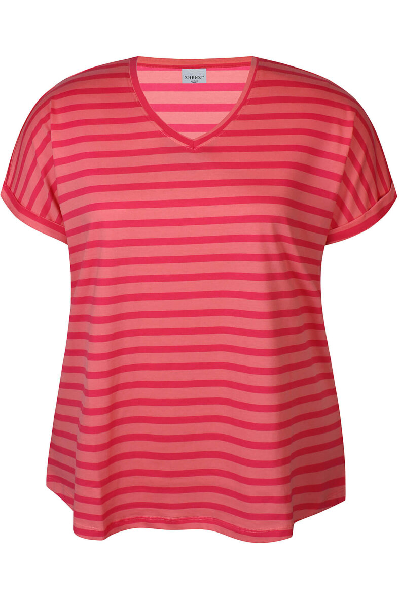 Farverig t-shirt i plus size fra Zhenzi i et enkelt stribet design i røde nuancer.