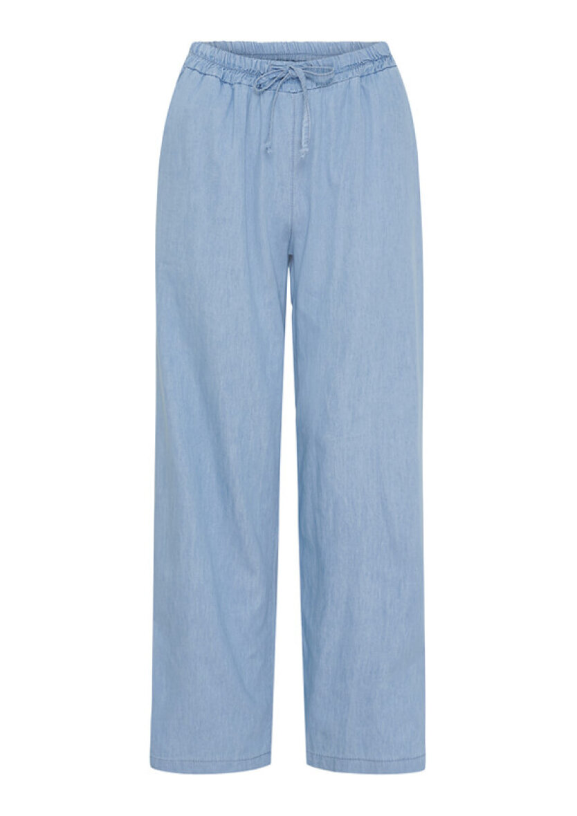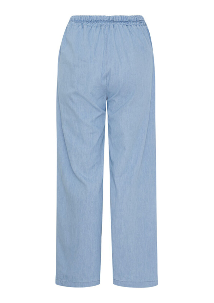 Buksen er med elastik i taljen samt bindebånd, så den nemt kan justeres til. Den lyseblå buks er lavet i en afslappet pasform i en skøn og let kvalitet i 100% bomuld. Med skrålommer i siderne.