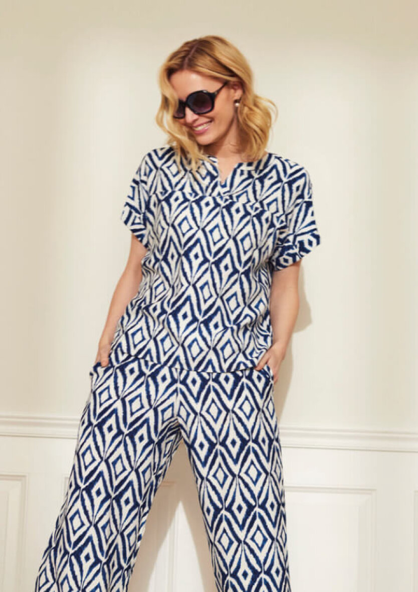 Stilfuld bluse, som kan styles på et hav af måder. Style evt. med et par lyse bukser eller et par blå jeans. Kan også styles med de matchende mønstrede bukser, som et fint sæt.