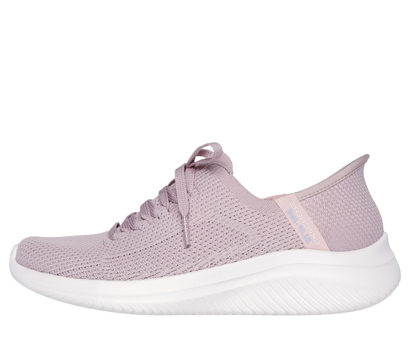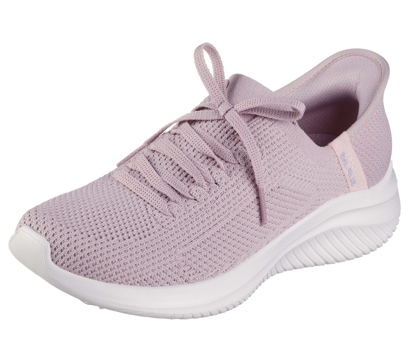 Lette lyserøde hands free slip-ins: Ultra Flex 3.0 - Elevated Motion fra Skechers. Skoen er lavet i blødt vævet mesh tekstil med stretch fit, som giver en sok-lignende komfort, som tilpasser sig foden. God og fleksibel pasform med dekorative No Tie Fit snørebånd, som altid forbliver bundet.