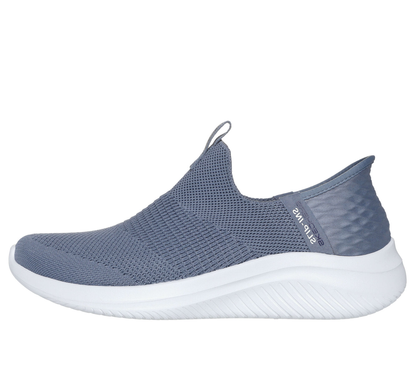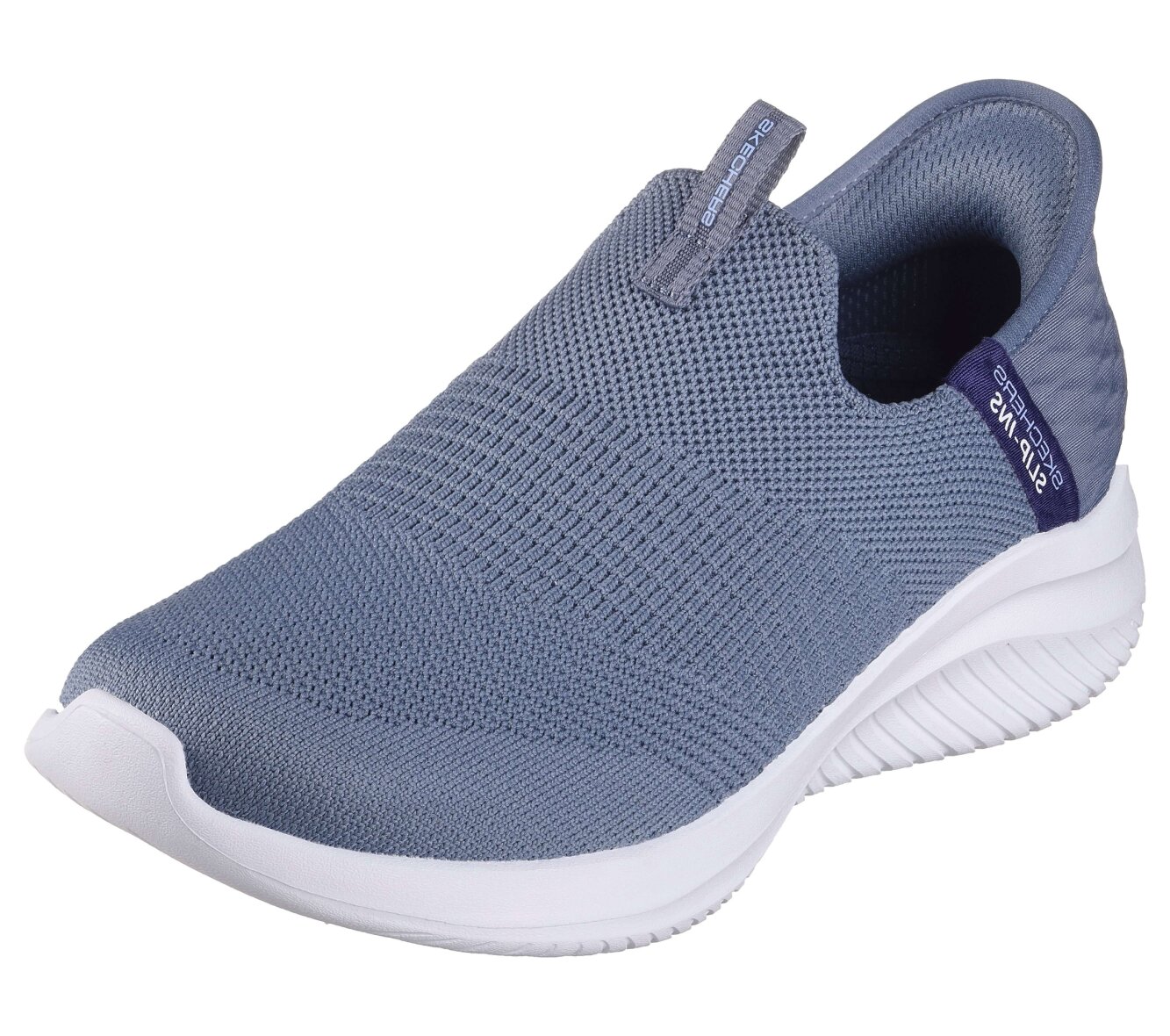 Lette blå-grå hands free slip-ins: Ultra Flex 3.0 - Cozy Streak fra Skechers. Skoen er lavet i blødt vævet mesh tekstil med stretch fit, som giver en sok-lignende komfort, som tilpasser sig foden. God og fleksibel pasform uden snøre.
