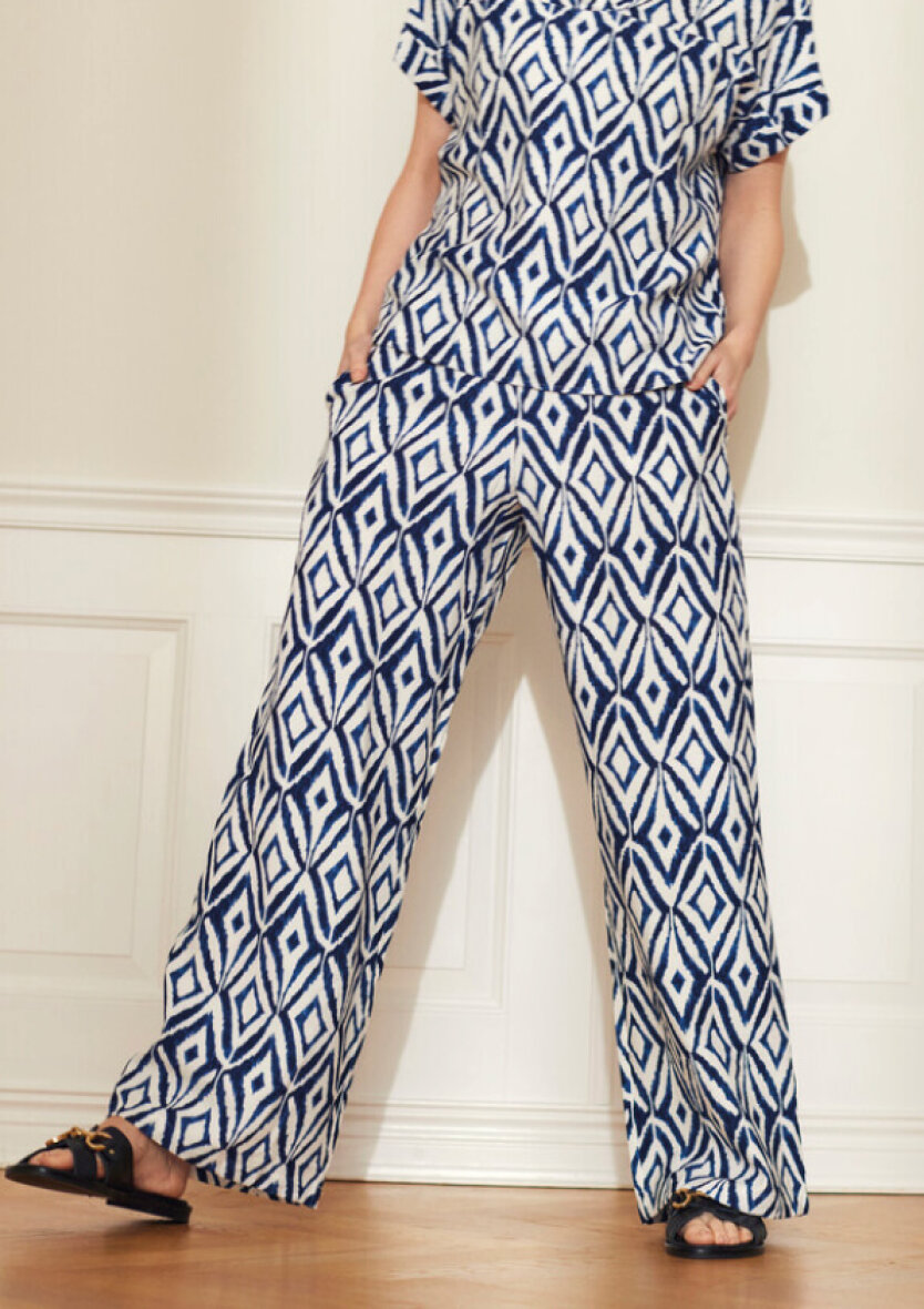 Mønstrede bukser fra Brandtex i det smukkeste print i blå nuancer. Bukserne er lavet i et komfortabelt design med brede bukseben.