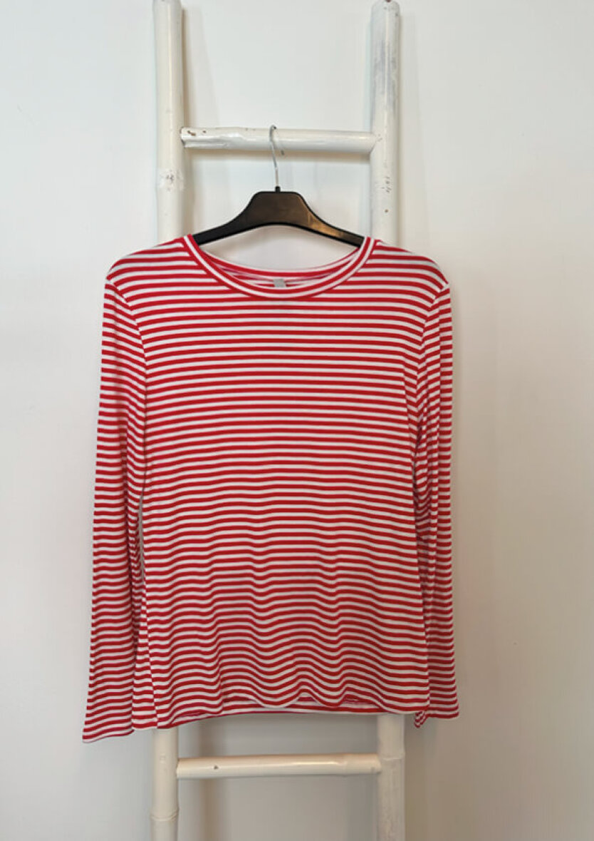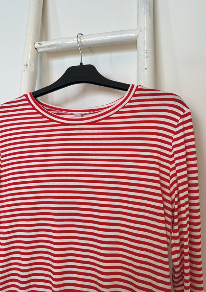 Klassisk langærmet t-shirt fra Lisbeth Merrild, lavet i et stribet design. De smalle striber er i farverne hvid og rød, hvilket er en skøn farve som kan give lidt kulør til outfittet. T-shirten er med lange ærmer og rund hals.