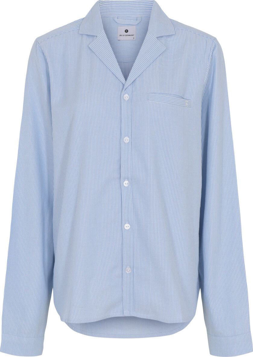 Pyjamas skjorten er med klassisk krave og v-halsudskæring samt gennemgående knapper langs fronten. Skjorten er med lange ærmer og en lille brystlomme. Lavet i en afslappet pasform i en skøn kvalitet i en blanding af viskose (Bambus) og økologisk bomuld, hvilket giver en let og åndbar kvalitet.