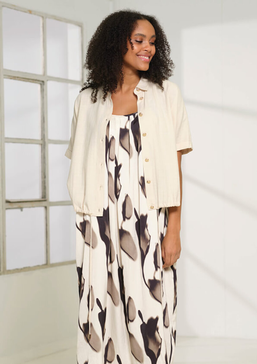 Blusen er lavet i et afslappet og stilfuldt design med gennemgående guldfarvede knapper langs fronten. Blusen er med skjortekrave og korte ærmer med opsmøg. Den sandfarvede bluse er med bindebånd i bunden, som gør at den kan styles enten løsthængende eller med en mere tilpasset pasform. Lavet i en blød og let kvalitet i en blanding af bomuld og viskose.