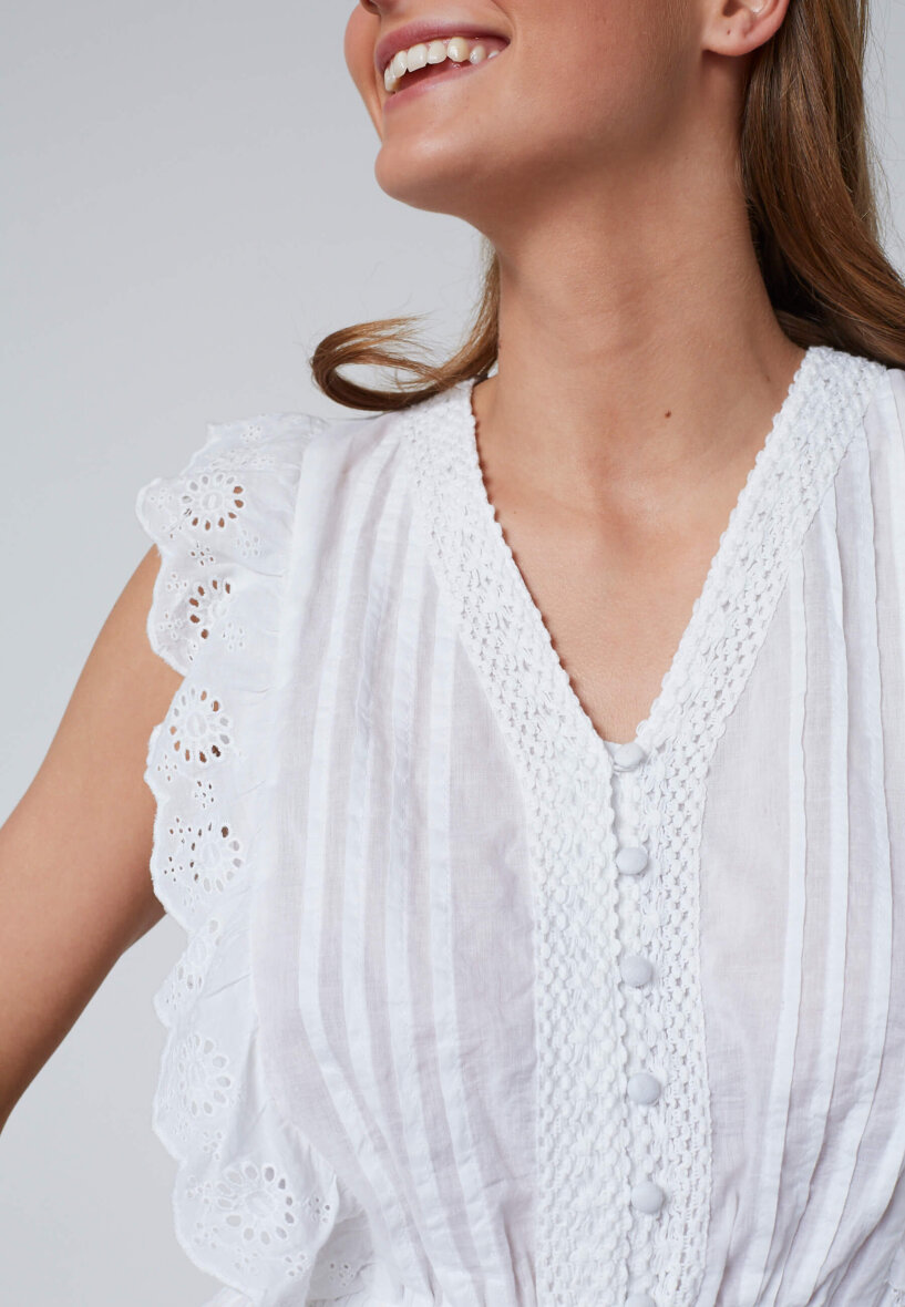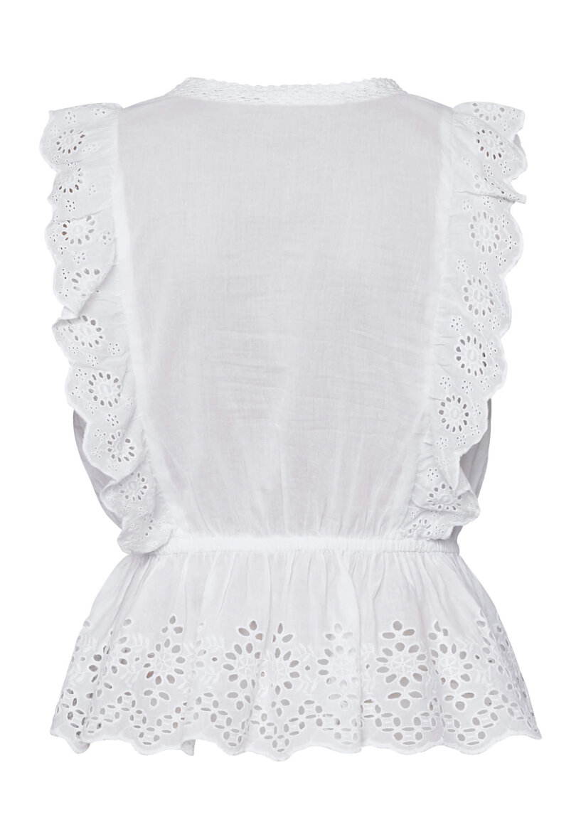 Den hvide top er spækket med flotte flæser og broderi anglaise detaljer. Toppen er med et lille flæse ærme, som tilføjer et sødt og sommerligt look. Lavet med v-halsudskæring og et feminint snit med elastik i taljen. Skøn og let kvalitet i 100% bomuld.